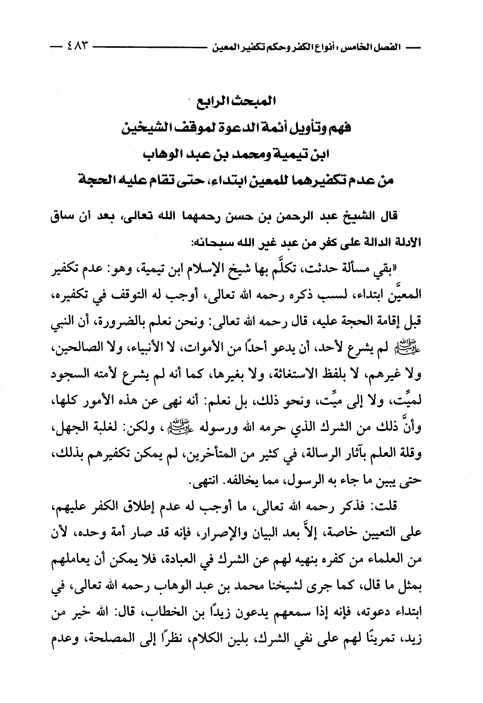 «بقي مسألة حدثت، تكلَّم بها شيخ الإسلام ابن تيمية، وهو: عدم تكفير المعيَّن ابتداء، لسب ذكره رحمه الله تعالى، أوجب له التوقف في تكفيره، قبل إقامة الحجة عليه، قال رحمه الله تعالى: ونحن نعلم بالضرورة، أن النبي - صلى الله عليه وسلم - لم يشرع لأحد، أن يدعو أحدًا من الأموات، لا الأنبياء، ولا الصالحين، ولا غيرهم، لا بلفظ الاستغاثة، ولا بغيرها، كما أنه لم يشرع لأمته السجود لميِّت، ولا إلى ميِّت، ونحو ذلك، بل نعلم: أنه نهى عن هذه الأمور كلها، وأنَّ ذلك من الشرك الذي حرمه الله ورسوله - صلى الله عليه وسلم -، ولكن: لغلبة الجهل، وقلة العلم بآثار الرسالة، في كثير من المتأخرين، لم يمكن تكفيرهم بذلك، حتى يبين ما جاء به الرسول، مما يخالفه. انتهى.