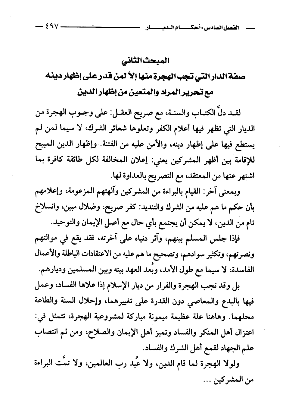لقد دلَّ الكتاب والسنة، مع صريح العقل: على وجوب الهجرة من الديار التي تظهر فيها أعلام الكفر وتعلوها شعائر الشرك، لا سيما لمن لم يستطع فيها على إظهار دينه، والأمن عليه من الفتنة. وإظهار الدين المبيح للإقامة بين أظهر المشركين يعني: إعلان المخالفة لكل طائفة كافرة بما اشتهر عنها من المعتقد، مع التصريح بالعداوة لها.