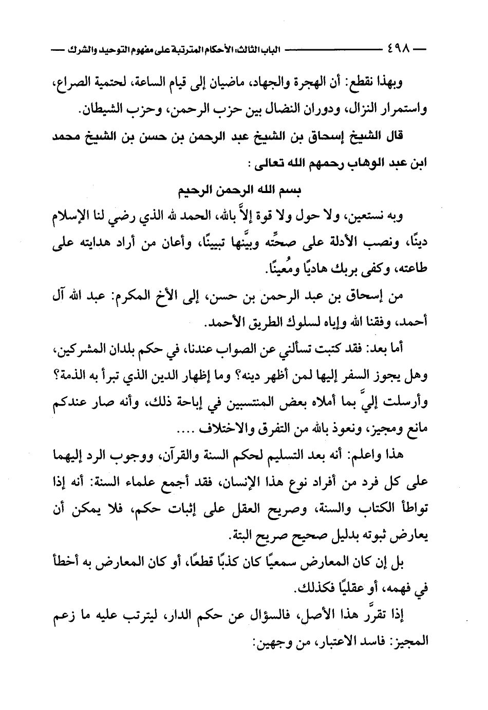 أما بعد: فقد كتبت تسألني عن الصواب عندنا، في حكم بلدان المشركين، وهل يجوز السفر إليها لمن أظهر دينه؟ وما إظهار الدين الذي تبرأ به الذمة؟ وأرسلت إليَّ بما أملاه بعض المنتسبين في إباحة ذلك، وأنه صار عندكم مانع ومجيز، ونعوذ بالله من التفرق والاختلاف ....