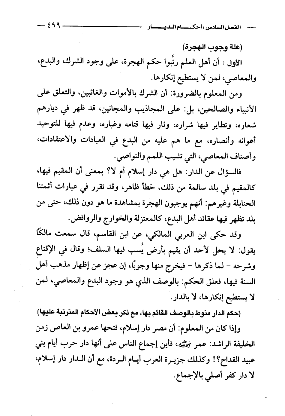 وقد حكى ابن العربي المالكي، عن ابن القاسم، قال سمعت مالكًا يقول: لا يحل لأحد أن يقيم بأرض يُسب فيها السلف؛ وقال في الإقناع وشرحه - لما ذكرها - فيخرج منها وجوبًا، إن عجز عن إظهار مذهب أهل السنة فيها، فعلق الحكم: بالوصف الذي هو وجود البدع والمعاصي، لمن لا يستطيع إنكارها، إلا بالدار.