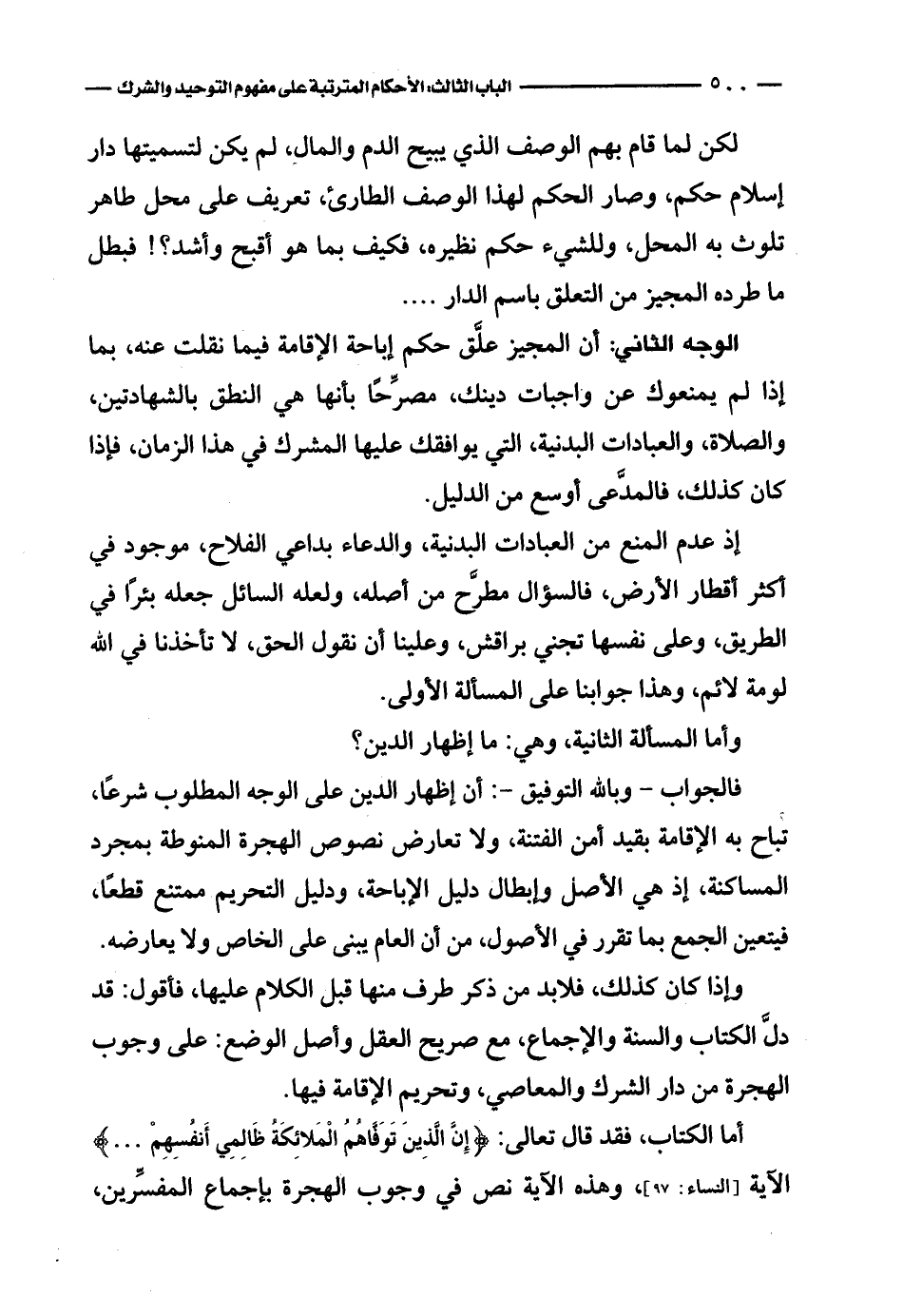 فالجواب - وبالله التوفيق -: أن إظهار الدين على الوجه المطلوب شرعًا، تباح به الإقامة بقيد أمن الفتنة، ولا تعارض نصوص الهجرة المنوطة بمجرد المساكنة، إذ هي الأصل وإبطال دليل الإباحة، ودليل التحريم ممتنع قطعًا، فيتعين الجمع بما تقرر في الأصول، من أن العام يبنى على الخاص ولا يعارضه.