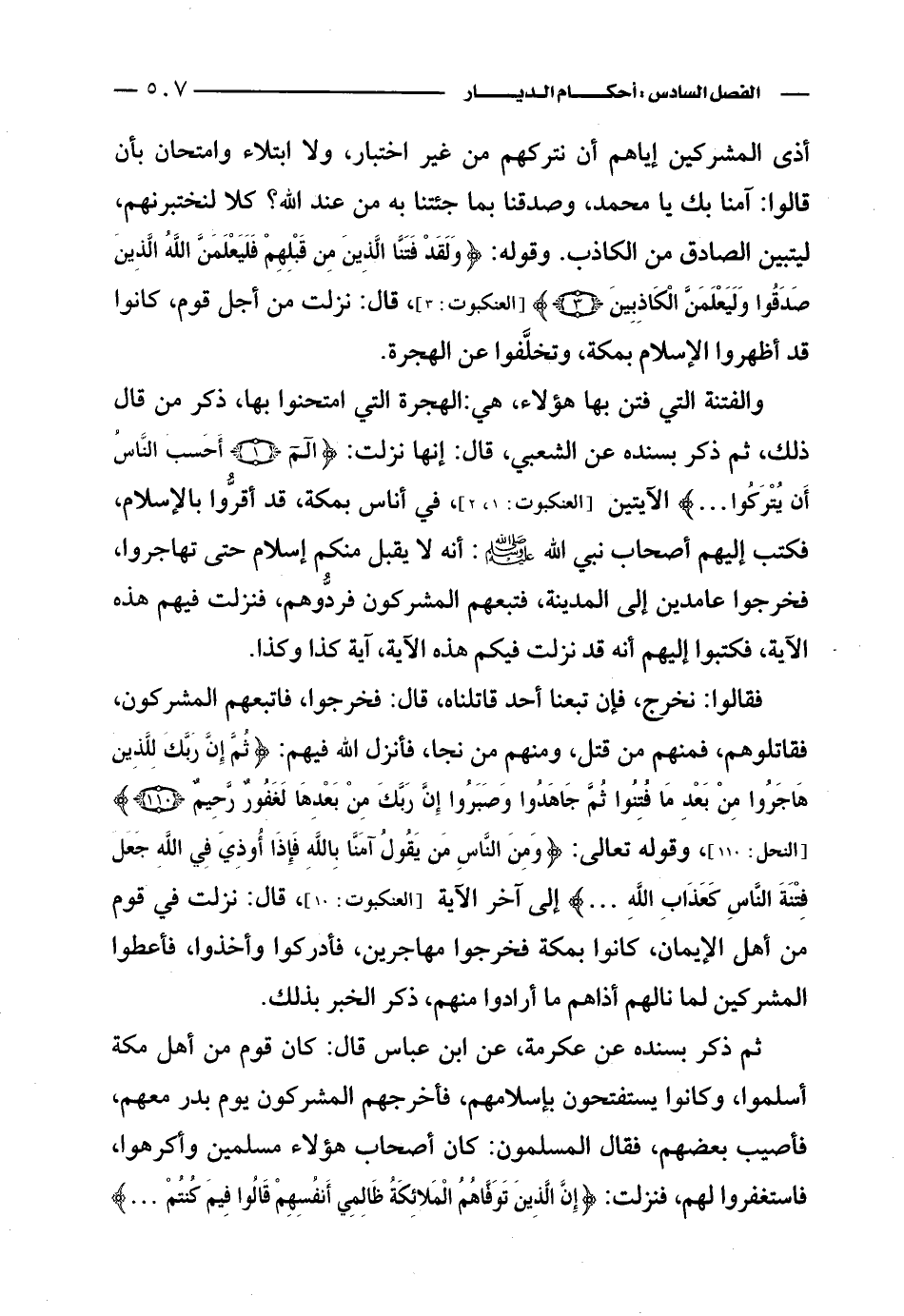 فقالوا: نخرج، فإن تبعنا أحد قاتلناه، قال: فخرجوا، فاتبعهم المشركون، فقاتلوهم، فمنهم من قتل، ومنهم من نجا، فأنزل الله فيهم: {ثُمَّ إِنَّ رَبَّكَ لِلَّذِينَ هَاجَرُواْ مِن بَعْدِ مَا فُتِنُواْ ثُمَّ جَاهَدُواْ وَصَبَرُواْ إِنَّ رَبَّكَ مِن بَعْدِهَا لَغَفُورٌ رَّحِيمٌ} [النحل: 110]، وقوله تعالى: {وَمِنَ النَّاسِ مَن يَقُولُ آمَنَّا بِاللَّهِ فَإِذَا أُوذِيَ فِي اللَّهِ جَعَلَ فِتْنَةَ النَّاسِ كَعَذَابِ اللَّهِ ...} إلى آخر الآية [العنكبوت: 10]، قال: نزلت في قوم من أهل الإيمان، كانوا بمكة فخرجوا مهاجرين، فأدركوا وأخذوا، فأعطوا المشركين لما نالهم أذاهم ما أرادوا منهم، ذكر الخبر بذلك.
