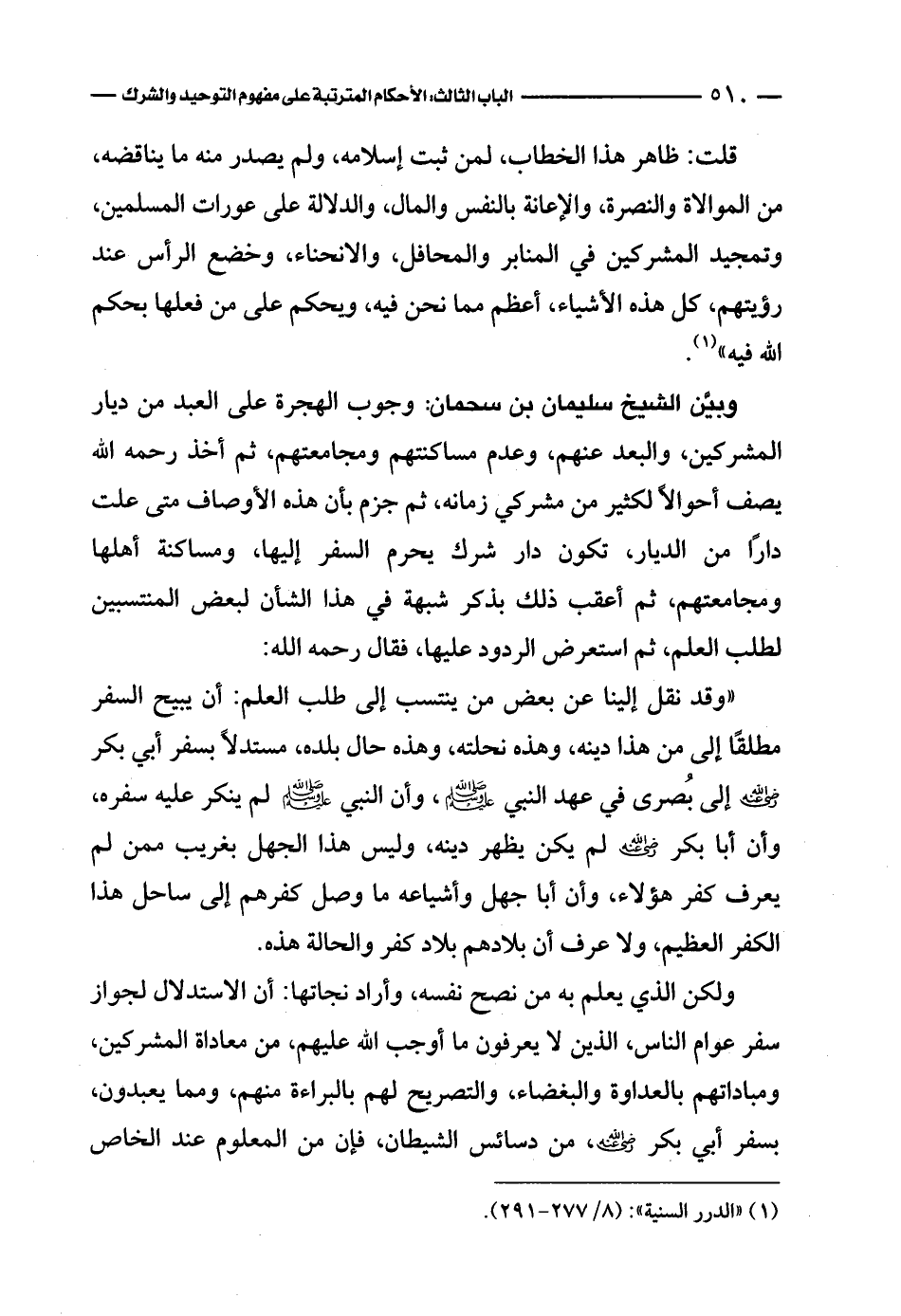 وبيَّن الشيخ سليمان بن سحمان: وجوب الهجرة على العبد من ديار المشركين، والبعد عنهم، وعدم مساكنتهم ومجامعتهم، ثم أخذ رحمه الله يصف أحوالاً لكثير من مشركي زمانه، ثم جزم بأن هذه الأوصاف متى علت دارًا من الديار، تكون دار شرك يحرم السفر إليها، ومساكنة أهلها ومجامعتهم، ثم أعقب ذلك بذكر شبهة في هذا الشأن لبعض المنتسبين لطلب العلم، ثم استعرض الردود عليها، فقال رحمه الله: