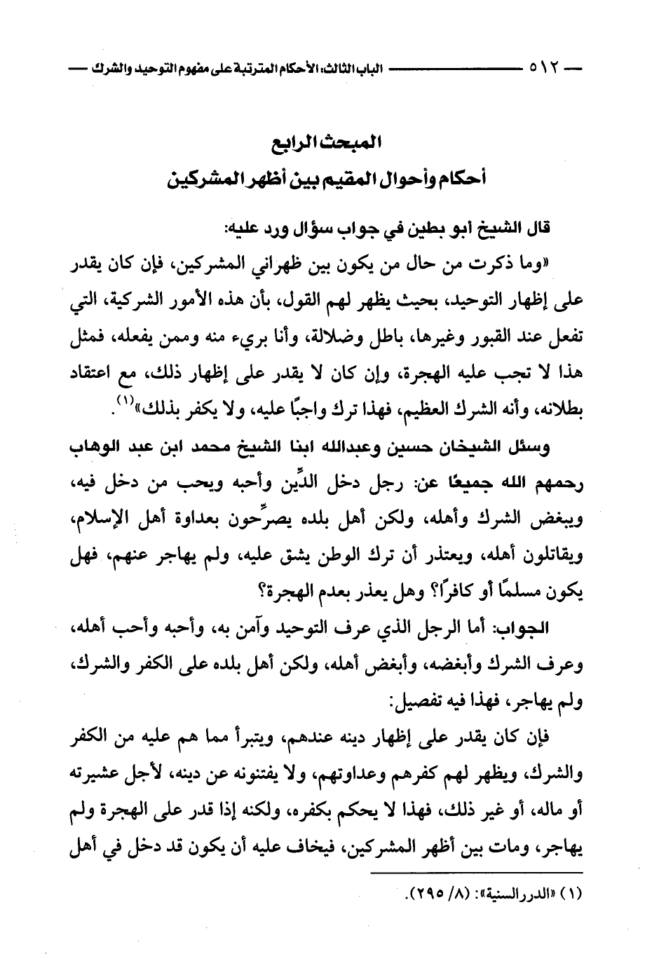 «وما ذكرت من حال من يكون بين ظهراني المشركين، فإن كان يقدر على إظهار التوحيد، بحيث يظهر لهم القول، بأن هذه الأمور الشركية، التي تفعل عند القبور وغيرها، باطل وضلالة، وأنا بريء منه وممن يفعله، فمثل هذا لا تجب عليه الهجرة، وإن كان لا يقدر على إظهار ذلك، مع اعتقاد بطلانه، وأنه الشرك العظيم، فهذا ترك واجبًا عليه، ولا يكفر بذلك» (¬1).
