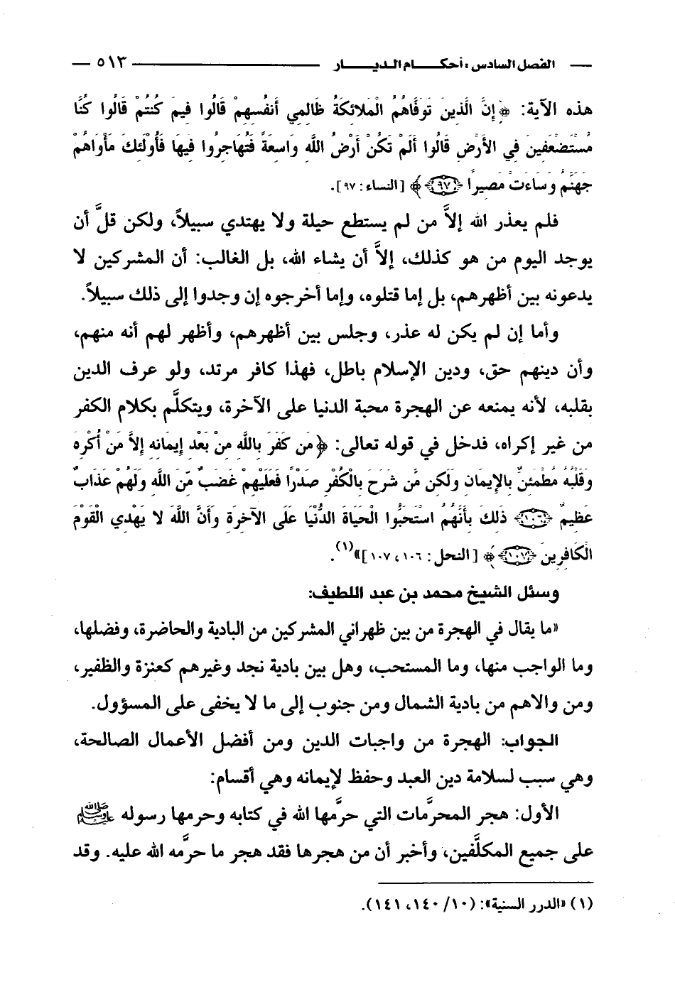 «ما يقال في الهجرة من بين ظهراني المشركين من البادية والحاضرة، وفضلها، وما الواجب منها، وما المستحب، وهل بين بادية نجد وغيرهم كعنزة والظفير، ومن والاهم من بادية الشمال ومن جنوب إلى ما لا يخفى على المسؤول.