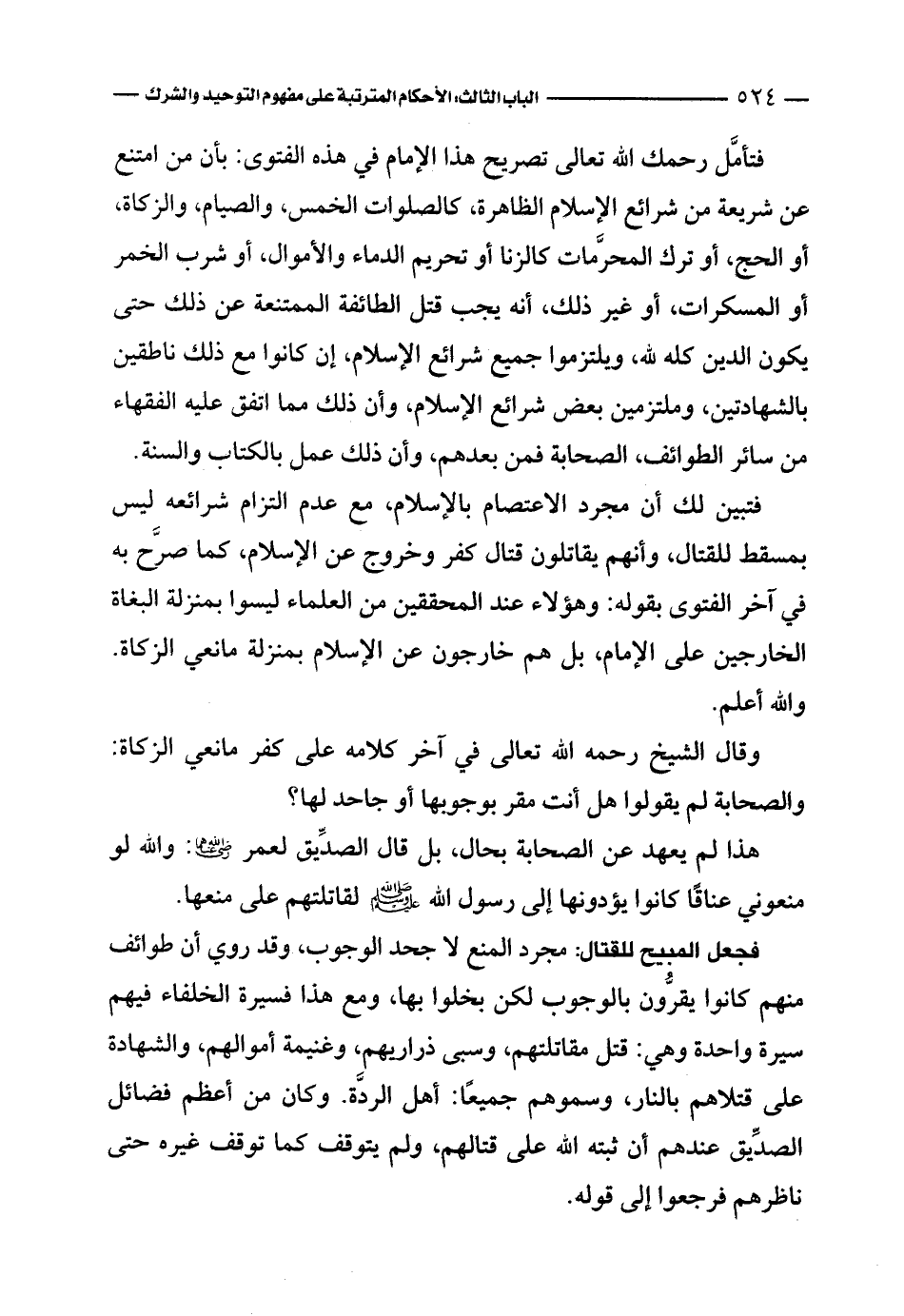 فتأمل رحمك الله تعالى تصريح هذا الإمام في هذه الفتوى: بأن من امتنع عن شريعة من شرائع الإسلام الظاهرة، كالصلوات الخمس، والصيام، والزكاة، أو الحج، أو ترك المحرَّمات كالزنا أو تحريم الدماء والأموال، أو شرب الخمر أو المسكرات، أو غير ذلك، أنه يجب قتل الطائفة الممتنعة عن ذلك حتى يكون الدين كله لله، ويلتزموا جميع شرائع الإسلام، إن كانوا مع ذلك ناطقين بالشهادتين، وملتزمين ببعض شرائع الإسلام، وأن ذلك مما اتفق عليه الفقهاء من سائر الطوائف، الصحابة فمن بعدهم، وأن ذلك عمل بالكتاب والسنة.