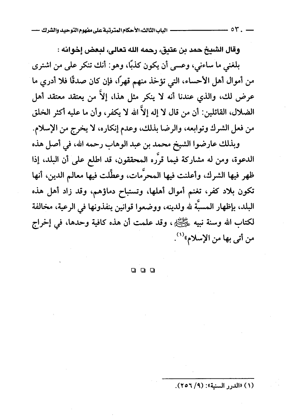 وبذلك عارضوا الشيخ محمد بن عبد الوهاب رحمه الله، في أصل هذه الدعوة، ومن له مشاركة فيما قرَّره المحققون، قد اطلع على أن البلد، إذا ظهر فيها الشرك، وأعلنت فيها المحرَّمات، وعطِّلت فيها معالم الدين، أنها تكون بلاد كفر، تغنم أموال أهلها، وتستباح دماؤهم، وقد زاد أهل هذه البلد، بإظهار المسبَّة لله ولدينه، ووضعوا قوانين ينفذونها في الرعية، مخالفة لكتاب الله وسنة نبيه - صلى الله عليه وسلم -، وقد علمت أن هذه كافية وحدها، في إخراج من أتى بها من الإسلام» (¬1).