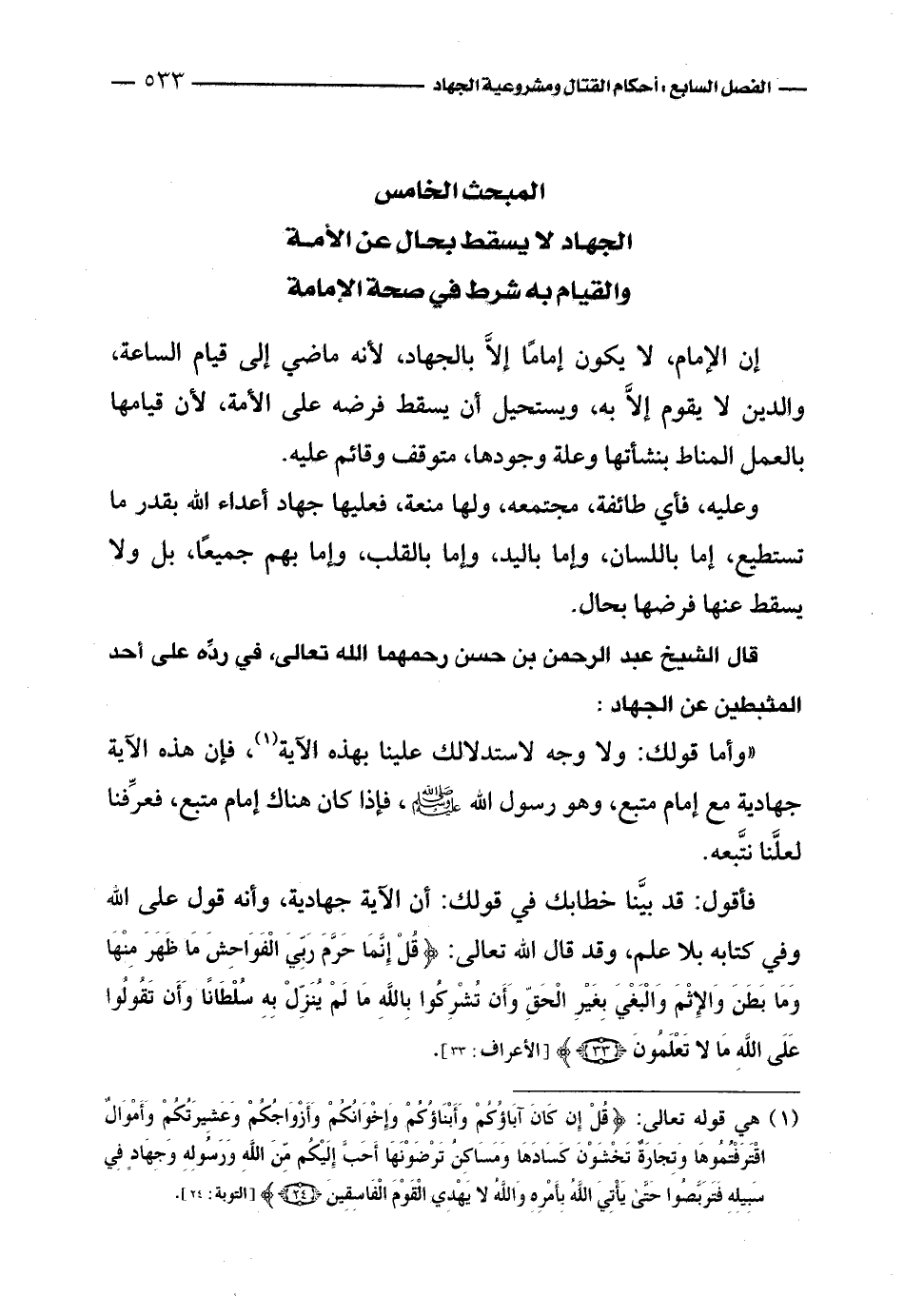إن الإمام، لا يكون إمامًا إلاَّ بالجهاد، لأنه ماضي إلى قيام الساعة، والدين لا يقوم إلاَّ به، ويستحيل أن يسقط فرضه على الأمة، لأن قيامها بالعمل المناط بنشأتها وعلة وجودها، متوقف وقائم عليه.