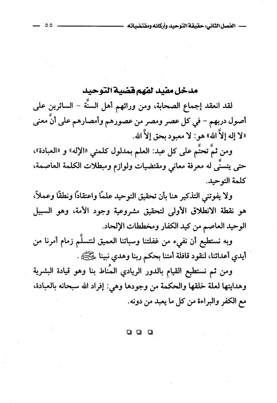 ولا يفوتني التذكير هنا بأن تحقيق التوحيد علمًا واعتقادًا ونطقًا وعملاً، هو نقطة الانطلاق الأولى لتحقيق مشروعية وجود الأمة، وهو السبيل الوحيد العاصم من كيد الكفار ومخططات الإلحاد.