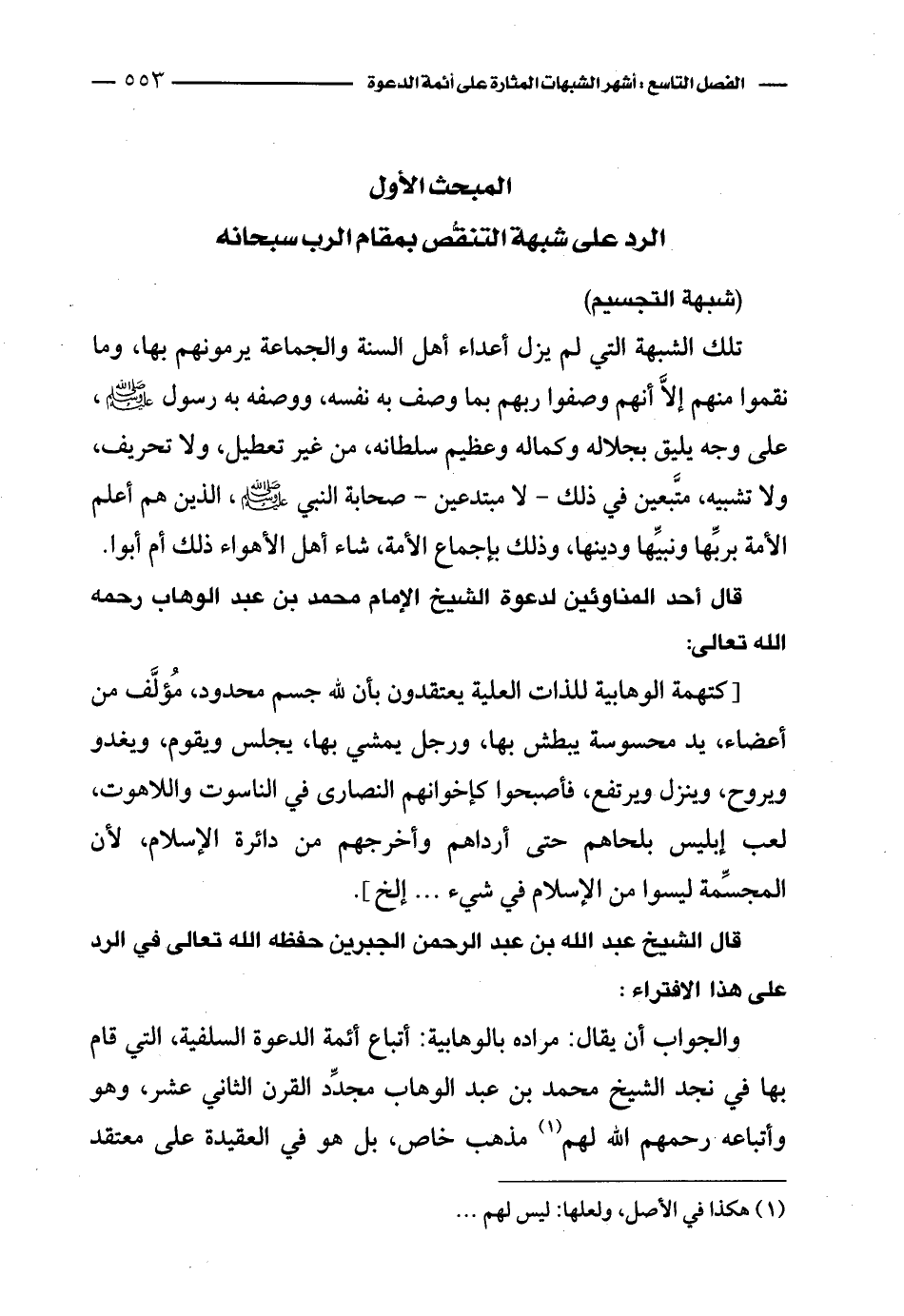 [كتهمة الوهابية للذات العلية يعتقدون بأن لله جسم محدود، مُؤلَّف من أعضاء، يد محسوسة يبطش بها، ورجل يمشي بها، يجلس ويقوم، ويغدو ويروح، وينزل ويرتفع، فأصبحوا كإخوانهم النصارى في الناسوت واللاهوت، لعب إبليس بلحاهم حتى أرداهم وأخرجهم من دائرة الإسلام، لأن المجسِّمة ليسوا من الإسلام في شيء ... إلخ].