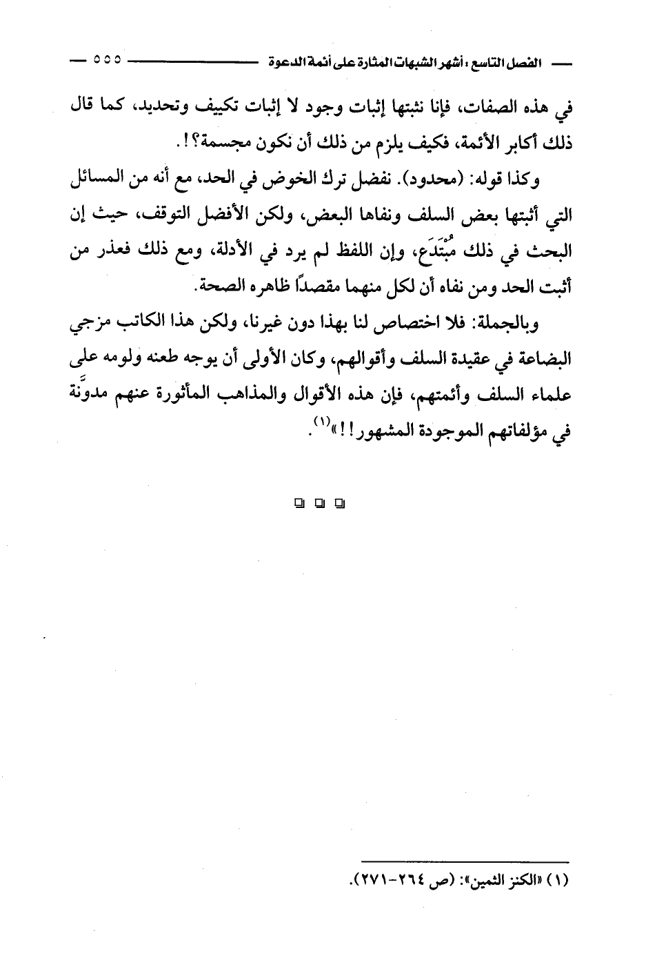 وبالجملة: فلا اختصاص لنا بهذا دون غيرنا، ولكن هذا الكاتب مزجي البضاعة في عقيدة السلف وأقوالهم، وكان الأولى أن يوجه طعنه لومه على علماء السلف وأئمتهم، فإن هذه الأقوال والمذاهب المأثورة عنهم مدونَّة في مؤلفاتهم الموجود المشهور!!» (¬1).