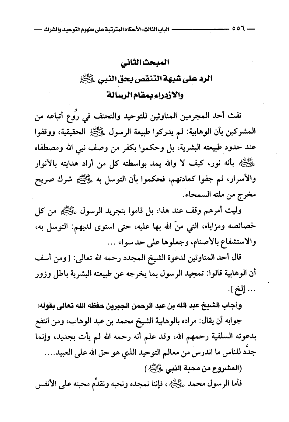 قال أحد المناوئين لدعوة الشيخ المجدد رحمه الله تعالى: [ومن أسف أن الوهابية قالوا: تمجيد الرسول بما يخرجه عن طبيعته البشرية باطل وزور ... إلخ].