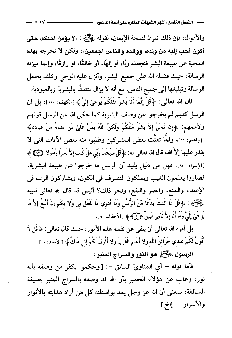فأما قوله - أي المناوئ السابق -: [وحكموا بكفر من وصفه بأنه نور، وغاب عن هؤلاء الحمير بأن الله قد وصفه بالسراج المنير بصيغة المبالغة، بمعنى أن الله عز وجل يمد بواسطته كل من أراد هدايته بالأنوار والأسرار ... إلخ].