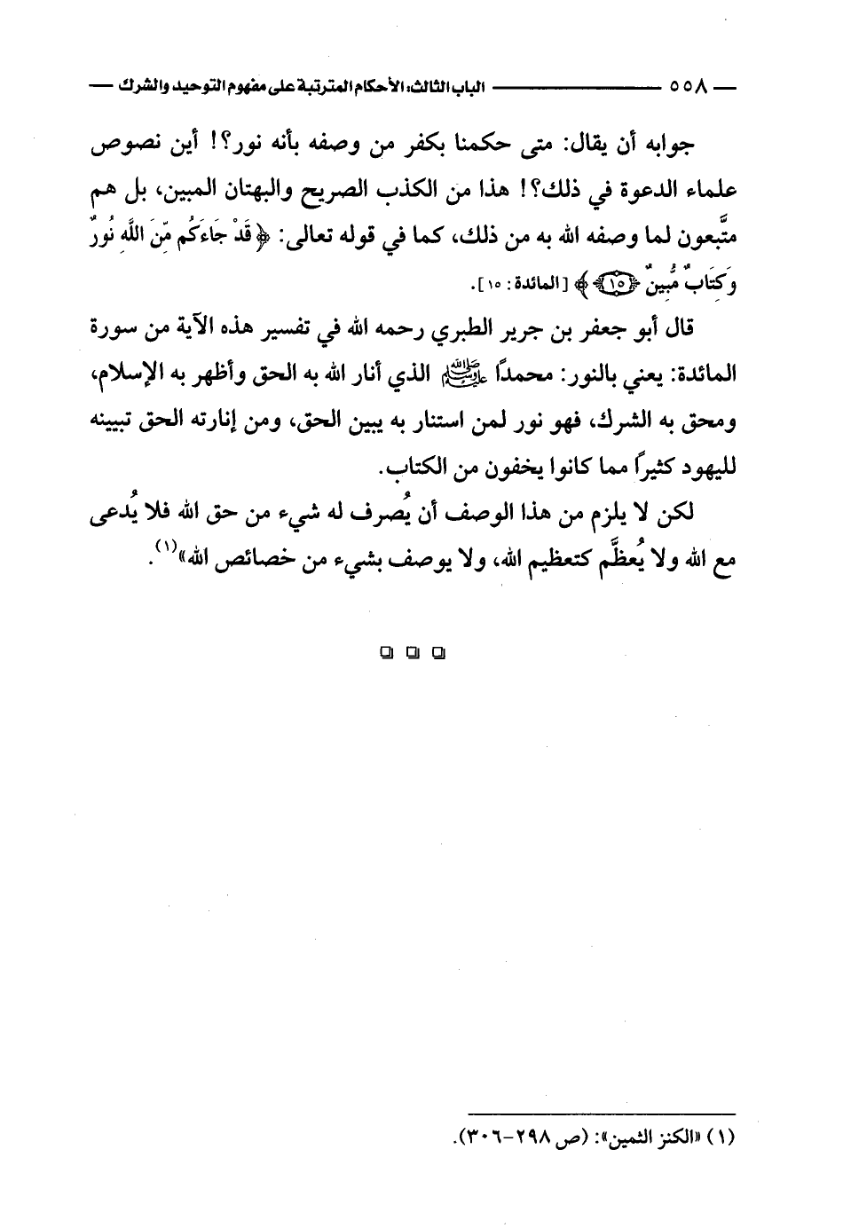 قال أبو جعفر بن جرير الطبري رحمه الله في تفسير هذه الآية من سورة المائدة: يعني بالنور: محمدًا - صلى الله عليه وسلم - الذي أنار الله به الحق وأظهر به الإسلام، ومحق به الشرك، فهو نور لمن استنار به يبين الحق، ومن إنارته الحق تبيينه لليهود كثيرًا مما كانوا يخفون من الكتاب.