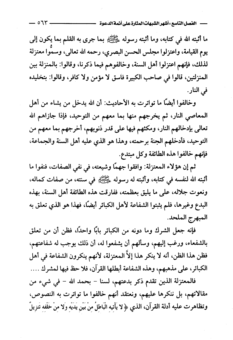 فالمعتزلة الذين تقدم ذكر بدعتهم، لسنا بحمد الله في شيء من مقالاتهم، بل ننكرها عليهم، ونعتقد أنهم خالفوا ما تواترت به النصوص، وتظاهرت عليه أدلة القرآن، الذي {لَا يَأْتِيهِ الْبَاطِلُ مِن بَيْنِ يَدَيْهِ وَلَا مِنْ خَلْفِهِ تَنزِيلٌ