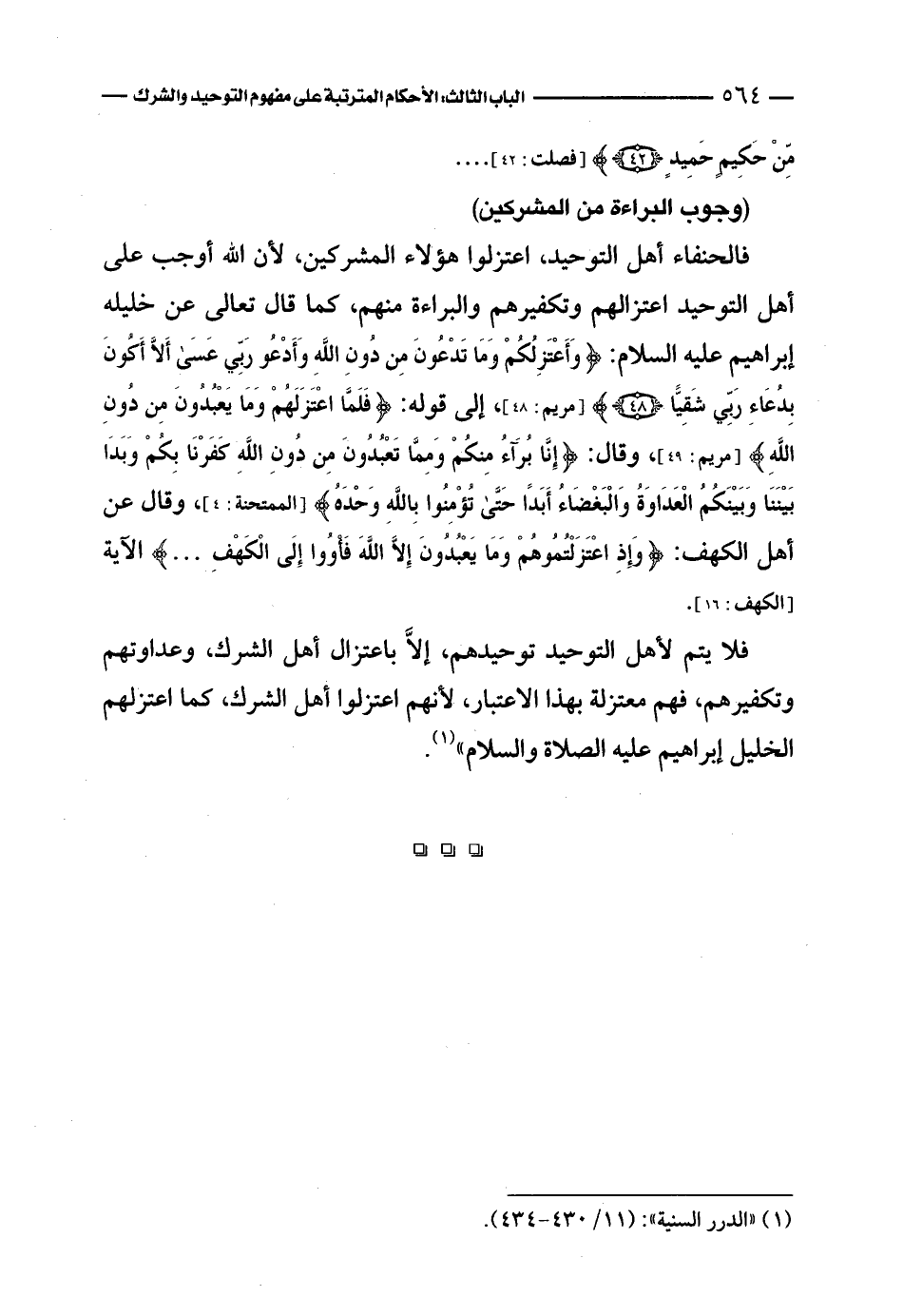 فلا يتم لأهل التوحيد توحيدهم، إلاَّ باعتزال أهل الشرك، وعداوتهم وتكفيرهم، فهم معتزلة بهذا الاعتبار، لأنهم اعتزلوا أهل الشرك، كما اعتزلهم الخليل إبراهيم - عليه الصلاة والسلام -» (¬1).