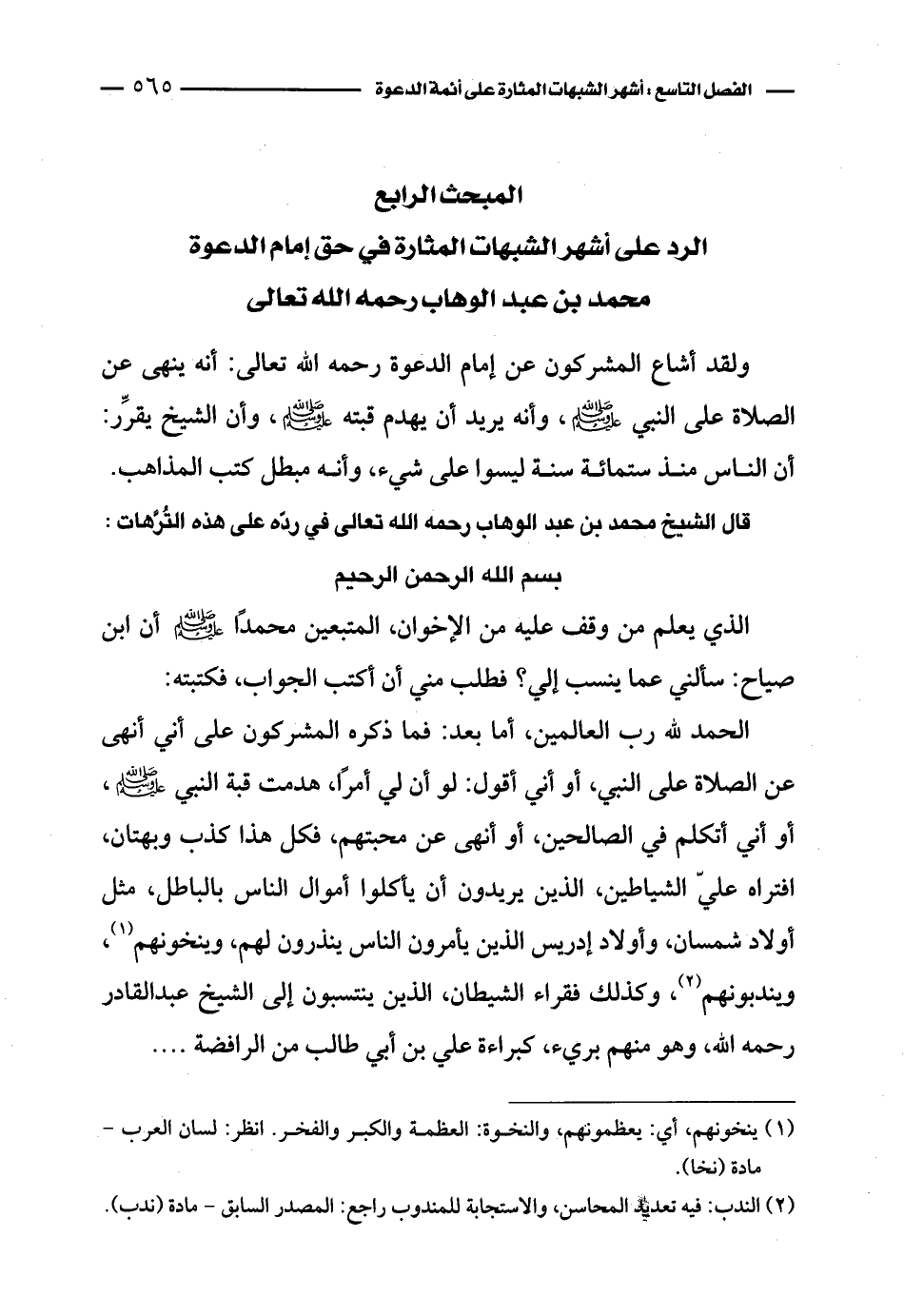 الحمد لله رب العالمين، أما بعد: فما ذكره المشركون على أني أنهى عن الصلاة على النبي، أو أني أقول: لو أن لي أمرًا، هدمت قبة النبي - صلى الله عليه وسلم -، أو أني أتكلم في الصالحين، أو أنهى عن محبتهم، فكل هذا كذب وبهتان، افتراه عليَّ الشياطين، الذين يريدون أن يأكلوا الناس بالباطل، مثل أولاد شمسان، وأولاد إدريس الذين يأمرون الناس ينذرون لهم، وينخونهم (¬1)، ويندبونهم (¬2)، وكذلك فقراء الشيطان، الذين ينتسبون إلى الشيخ عبد القادر رحمه الله، وهو منهم بريء، كبراءة علي بن أبي طالب من الرافضة ....