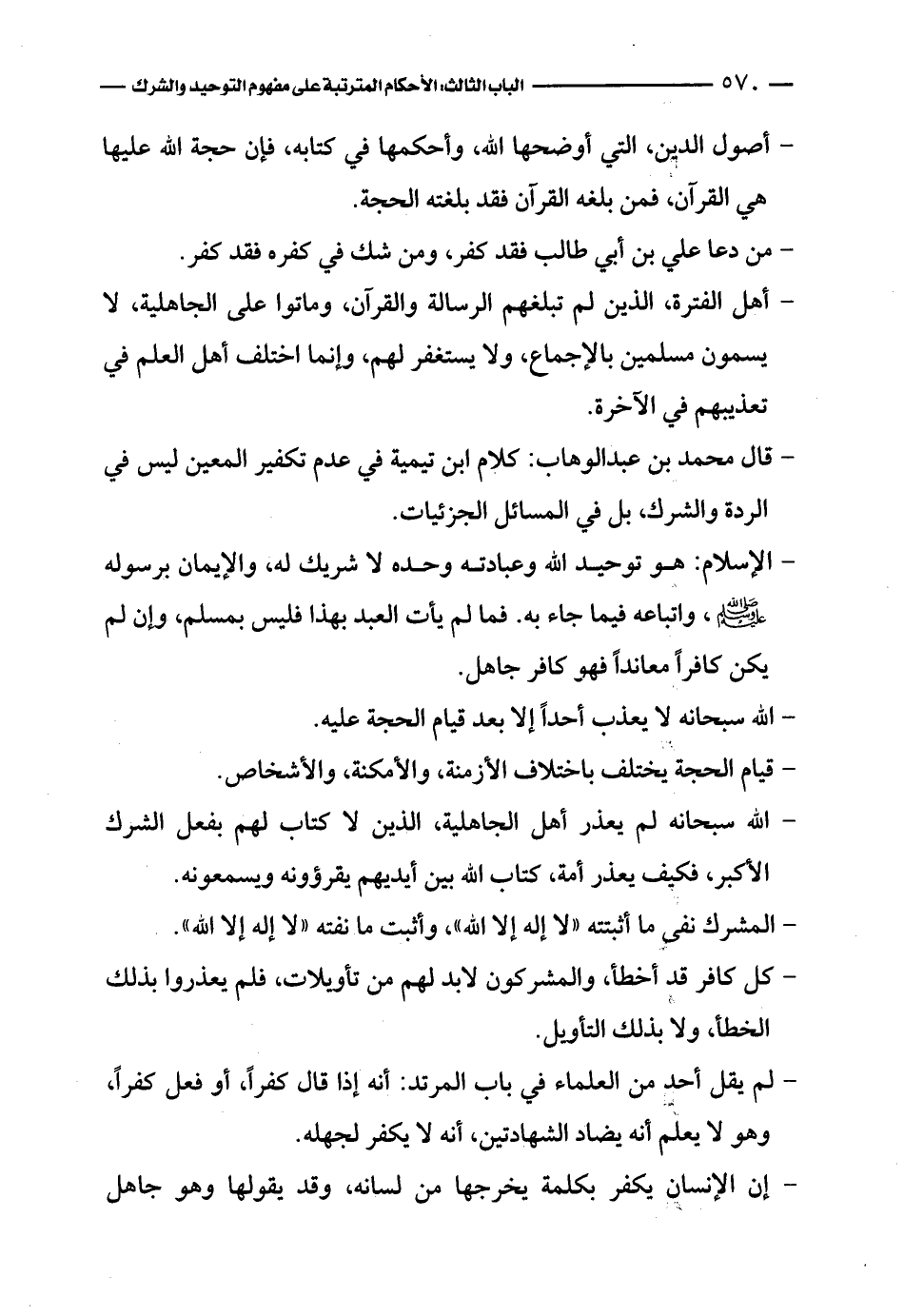 - قال محمد بن عبد الوهاب: كلام ابن تيمية في عدم تكفير المعين ليس فى تعذيبهم فى الآخرة.