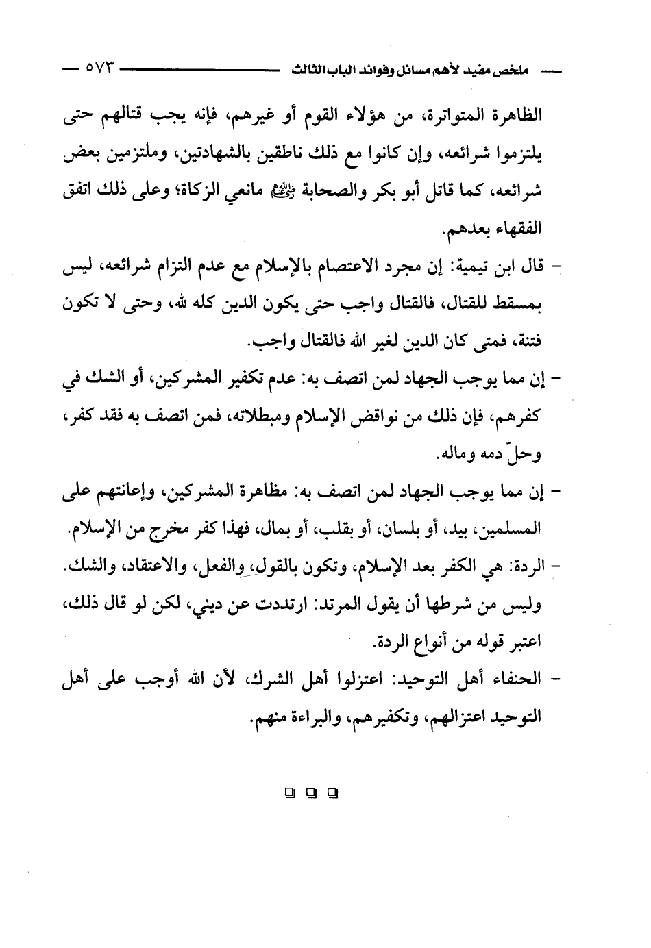الظاهرة المتواترة، من هؤلاء القوم أو غيرهم، فإنه يجب قتالهم حتى يلتزموا شرائعه، وإن كانوا مع ذلك ناطقين بالشهادتين، وملتزمين ببعض شرائعه، كما قاتل أبو بكر والصحابة - رضي الله عنهم - مانعي الزكاة؛ وعلى ذلك اتفق الفقهاء بعدهم.