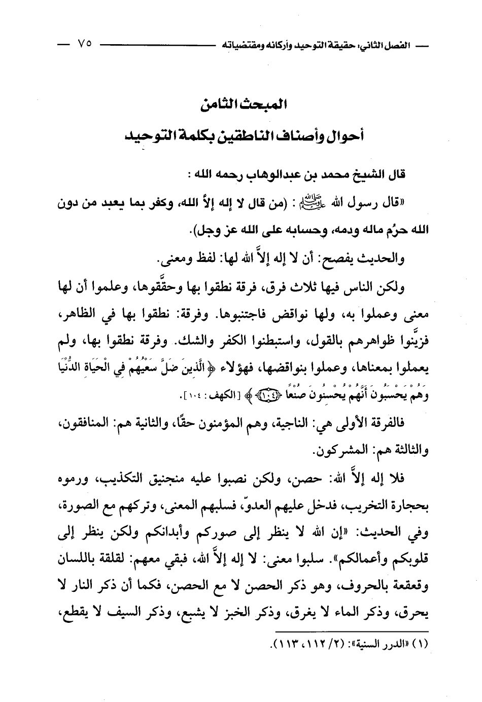 ولكن الناس فيها ثلاث فرق، فرقة نطقوا بها وحقَّقوها، وعلموا أن لها معنى وعملوا به، ولها نواقض فاجتنبوها. وفرقة: نطقوا بها في الظاهر، فزيَّنوا ظواهرهم بالقول، واستبطنوا الكفر والشك. وفرقة نطقوا بها، ولم يعملوا بمعناها، وعملوا بنواقضها، فهؤلاء {الَّذِينَ ضَلَّ سَعْيُهُمْ فِي الْحَيَاةِ الدُّنْيَا وَهُمْ يَحْسَبُونَ أَنَّهُمْ يُحْسِنُونَ صُنْعًا} [الكهف: 104] (¬1).