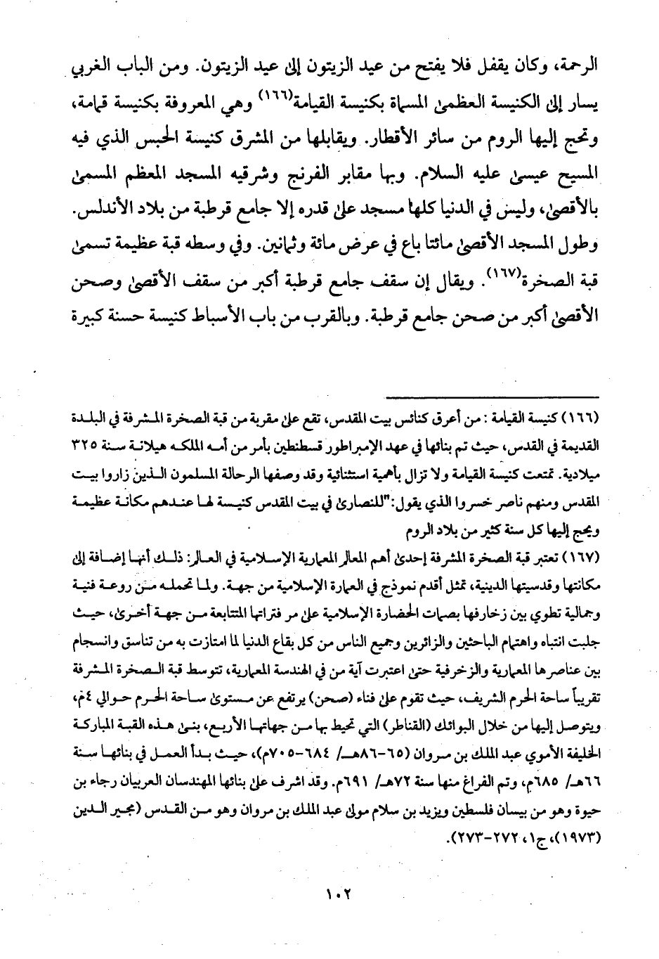 الرحمة، وكان يقفل فلا يفتح من عيد الزيتون إلى عيد الزيتون. ومن الباب الغربي يسار إلى الكنيسة العظمى المسماة بكنيسة القيامة وهي المعروفة بكنيسة قمامة، وتحج إليها الروم من سائر الأقطار. ويقابلها من المشرق كنيسة الحبس الذي فيه المسيح عيسى عليه السلام. وبها مقابر الفرنج وشرقيه المسجد المعظم المسمى بالأقصى، وليس في الدنيا كلها مسجد على قدره إلا جامع قرطبة من بلاد الأندلس. وطول المسجد الأقصى مائتا باع في عرض مائة وثمانين. وفي وسطه قبة عظيمة تسمى قبة الصخرة. ويقال إن سقف جامع قرطبة أكبر من سقف الأقصى وصحن الأقصى أكبر من صحن جامع قرطبة. وبالقرب من باب الأسباط كنيسة حسنة كبيرة