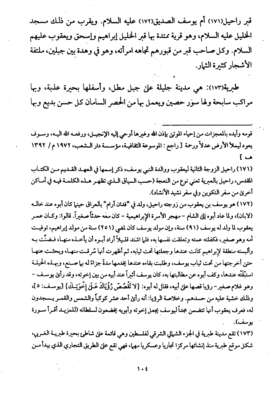 قبر راحيل أم يوسف الصديق عليه السلام. ويقرب من ذلك مسجد الخليل عليه السلام، وهو قرية ممتدة بها قبر الخليل إبراهيم وإسحق ويعقوب عليهم السلام. وكل صاحب قبر من قبورهم تجاهه امرأته، وهو في وهدة بين جبلين، ملتفة الأشجار كثيرة الثمار.