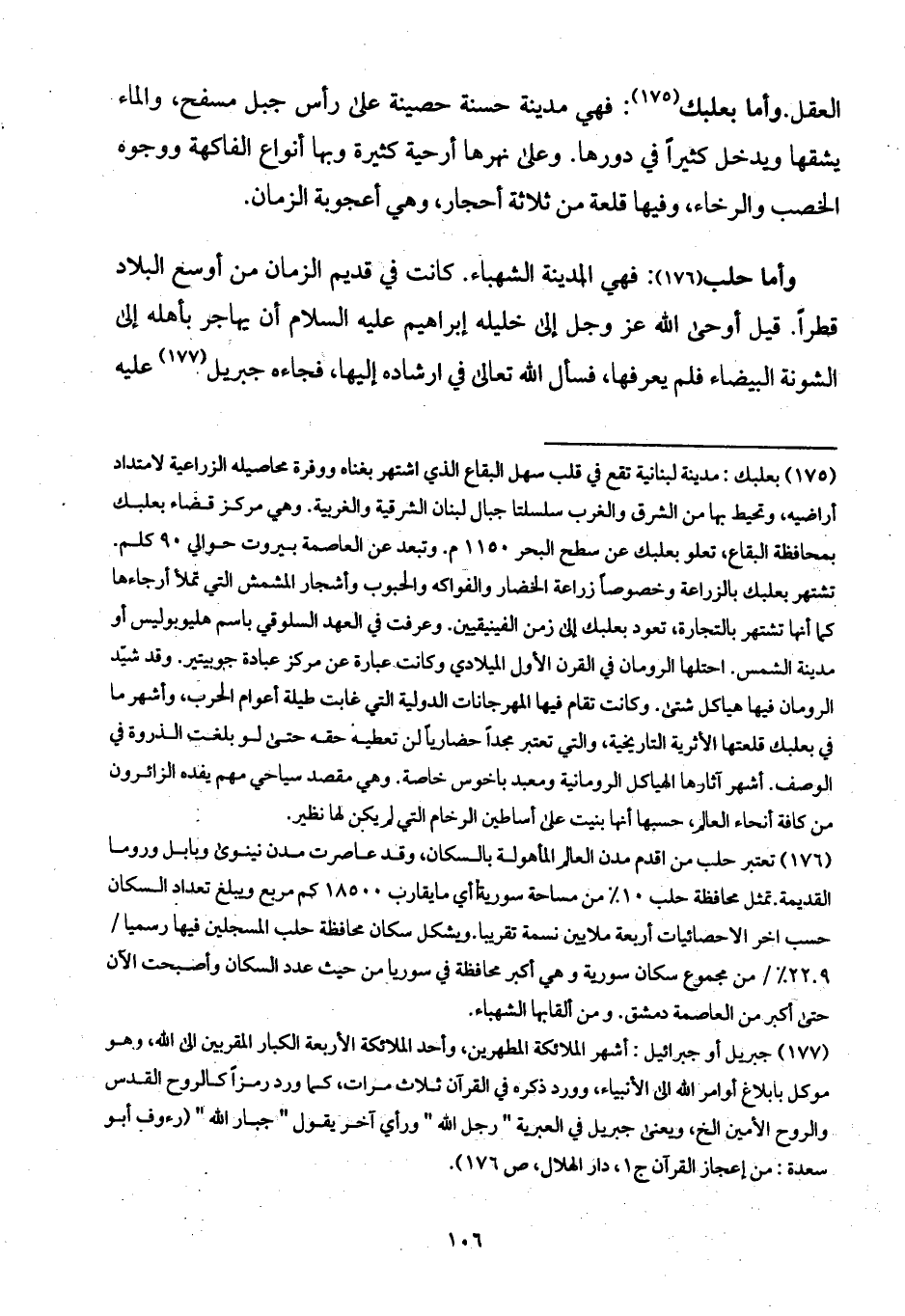 وأما بعلبك: فهي مدينة حسنة حصينة على رأس جبل مسفح، والماء يشقها ويدخل كثيراً في دورها. وعلى نهرها أرحية كثيرة وبها أنواع الفاكهة ووجوه الخصب والرخاء، وفيها قلعة من ثلاثة أحجار، وهي أعجوبة الزمان.