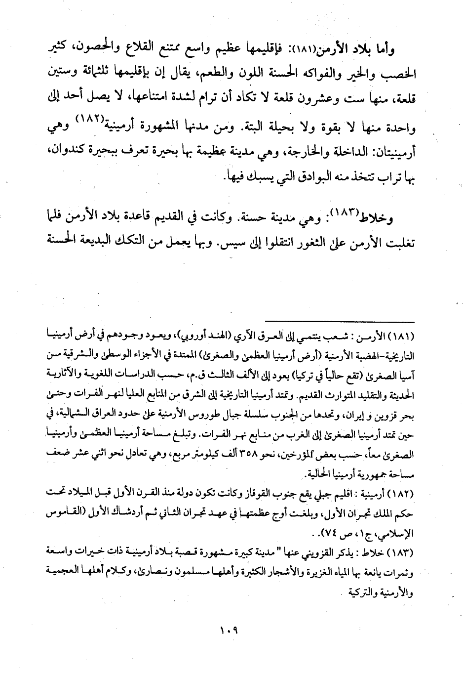 وأما بلاد الأرمن: فإقليمها عظيم واسع ممتنع القلاع والحصون، كثير الخصب والخير والفواكه الحسنة اللون والطعم، يقال إن بإقليمها ثلثمائة وستين قلعة، منها ست وعشرون قلعة لا تكاد أن ترام لشدة امتناعها، لا يصل أحد إلى واحدة منها لا بقوة ولا بحيلة البتة. ومن مدنها المشهورة أرمينية وهي أرمينيتان: الداخلة والخارجة، وهي مدينة عظيمة بها بحيرة تعرف ببحيرة كندوان، بها تراب تتخذ منه البوادق التي يسبك فيها.