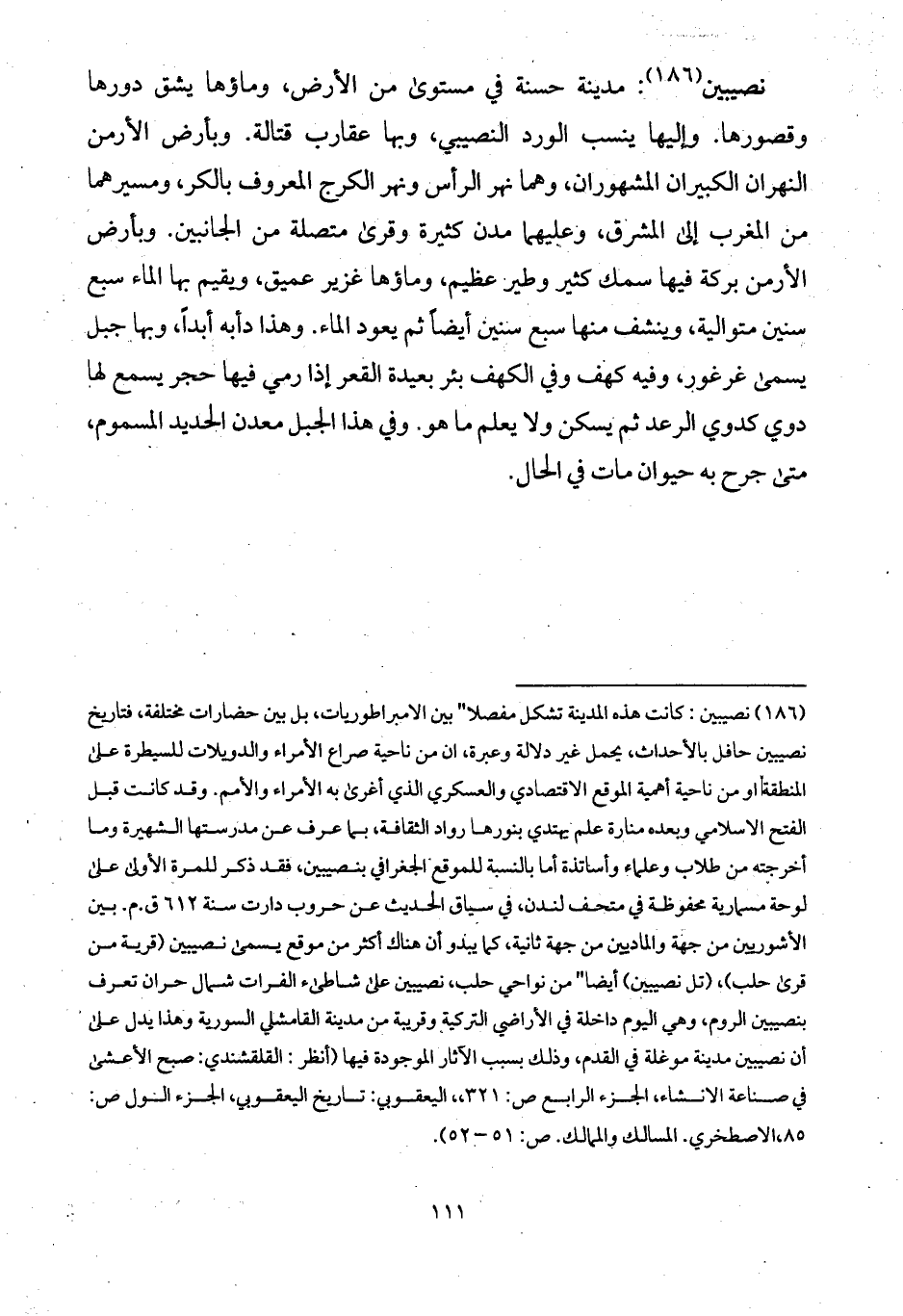 نصيبين: مدينة حسنة في مستوى من الأرض، وماؤها يشق دورها وقصورها. وإليها ينسب الورد النصيبي، وبها عقارب قتالة. وبأرض الأرمن النهران الكبيران المشهوران، وهما نهر الرأس ونهر الكرج المعروف بالكر، ومسيرهما من المغرب إلى المشرق، وعليهما مدن كثيرة وقرى متصلة من الجانبين. وبأرض الأرمن بركة فيها سمك كثير وطير عظيم، وماؤها غزير عميق، ويقيم بها الماء سبع سنين متوالية، وينشف منها سبع سنين أيضاً ثم يعود الماء. وهذا دأبه أبداً، وبها جبل يسمى غرغور، وفيه كهف وفي الكهف بئر بعيدة القعر إذا رمي فيها حجر يسمع لها دوي كدوي الرعد ثم يسكن ولا يعلم ما هو. وفي هذا الجبل معدن الحديد المسموم، متى جرح به حيوان مات في الحال.