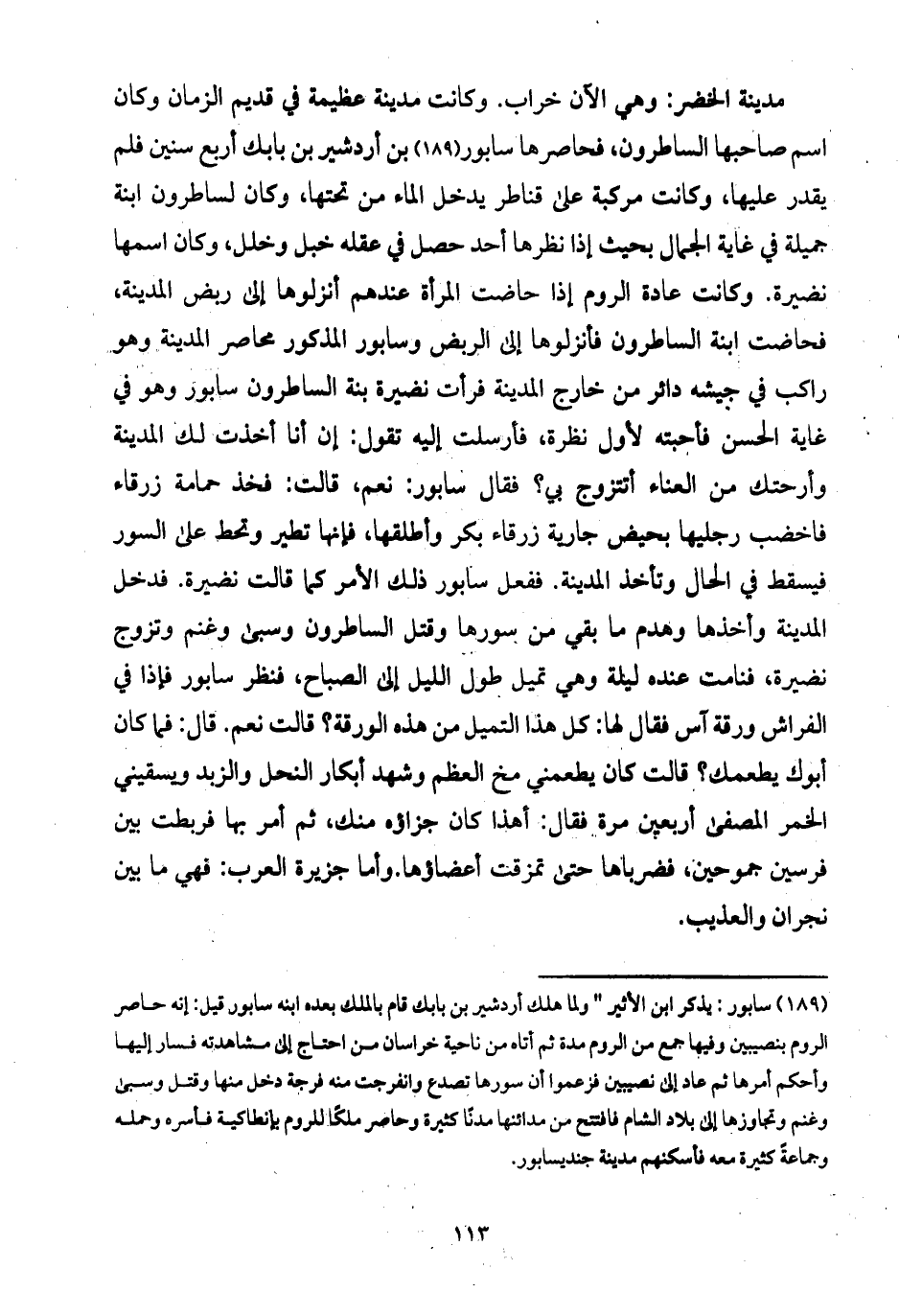 مدينة الخضر: وهي الآن خراب. وكانت مدينة عظيمة في قديم الزمان وكان اسم صاحبها الساطرون، فحاصرها سابور بن أردشير بن بابك أربع سنين فلم يقدر عليها، وكانت مركبة على قناطر يدخل الماء من تحتها، وكان لساطرون ابنة جميلة في غاية الجمال بحيث إذا نظرها أحد حصل في عقله خبل وخلل، وكان اسمها نضيرة. وكانت عادة الروم إذا حاضت المرأة عندهم أنزلوها إلى ربض المدينة، فحاضت ابنة الساطرون فأنزلوها إلى الربض وسابور المذكور محاصر المدينة وهو راكب في جيشه دائر من خارج المدينة فرأت نضيرة بنة الساطرون سابور وهو في غاية الحسن فأحبته لأول نظرة، فأرسلت إليه تقول: إن أنا أخذت لك المدينة وأرحتك من العناء أتتزوج بي؟ فقال سابور: نعم، قالت: فخذ حمامة زرقاء فاخضب رجليها بحيض جارية زرقاء بكر وأطلقها، فإنها تطير وتحط على السور فيسقط في الحال وتأخذ المدينة. ففعل سابور ذلك الأمر كما قالت نضيرة. فدخل المدينة وأخذها وهدم ما بقي من سورها وقتل الساطرون وسبى وغنم وتزوج نضيرة، فنامت عنده ليلة وهي تميل طول الليل إلى الصباح، فنظر سابور فإذا في الفراش ورقة آس فقال لها: كل هذا التميل من هذه الورقة؟ قالت نعم. قال: فما كان أبوك يطعمك؟ قالت كان يطعمني مخ العظم وشهد أبكار النحل والزبد ويسقيني الخمر المصفى أربعين مرة فقال: أهذا كان جزاؤه منك، ثم أمر بها فربطت بين فرسين جموحين، فضرباها حتى تمزقت أعضاؤها.