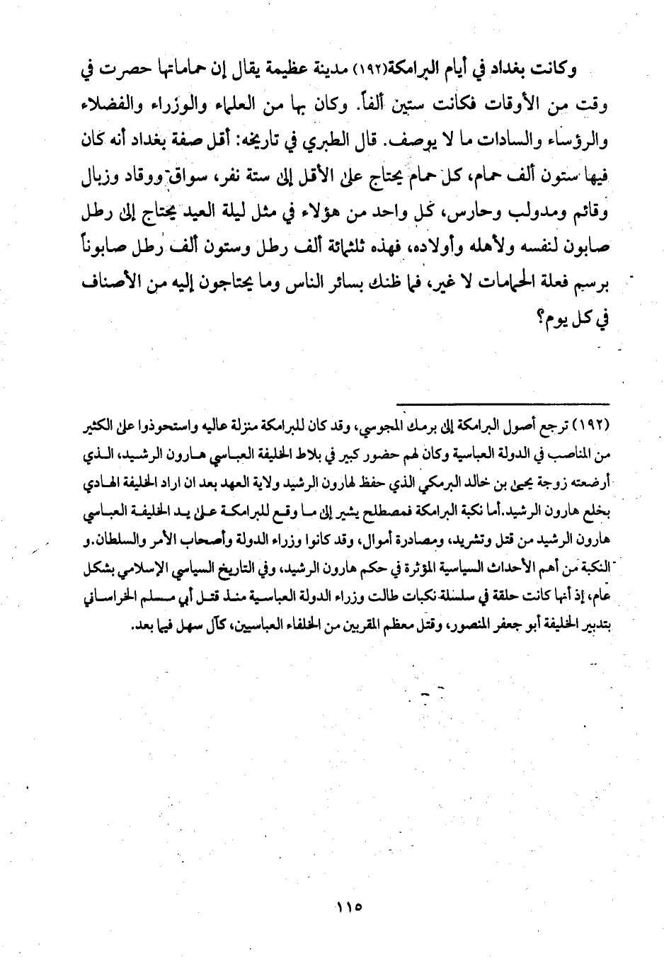 وكانت بغداد في أيام البرامكة مدينة عظيمة يقال إن حماماتها حصرت في وقت من الأوقات فكانت ستين ألفاً. وكان بها من العلماء والوزراء والفضلاء والرؤساء والسادات ما لا يوصف. قال الطبري في تاريخه: أقل صفة بغداد أنه كان فيها ستون ألف حمام، كل حمام يحتاج على الأقل إلى ستة نفر، سواق ووقاد وزبال وقائم ومدولب وحارس، كل واحد من هؤلاء في مثل ليلة العيد يحتاج إلى رطل صابون لنفسه ولأهله وأولاده، فهذه ثلثمائة ألف رطل وستون ألف رطل صابوناً برسم فعلة الحمامات لا غير، فما ظنك بسائر الناس وما يحتاجون إليه من الأصناف في كل يوم؟