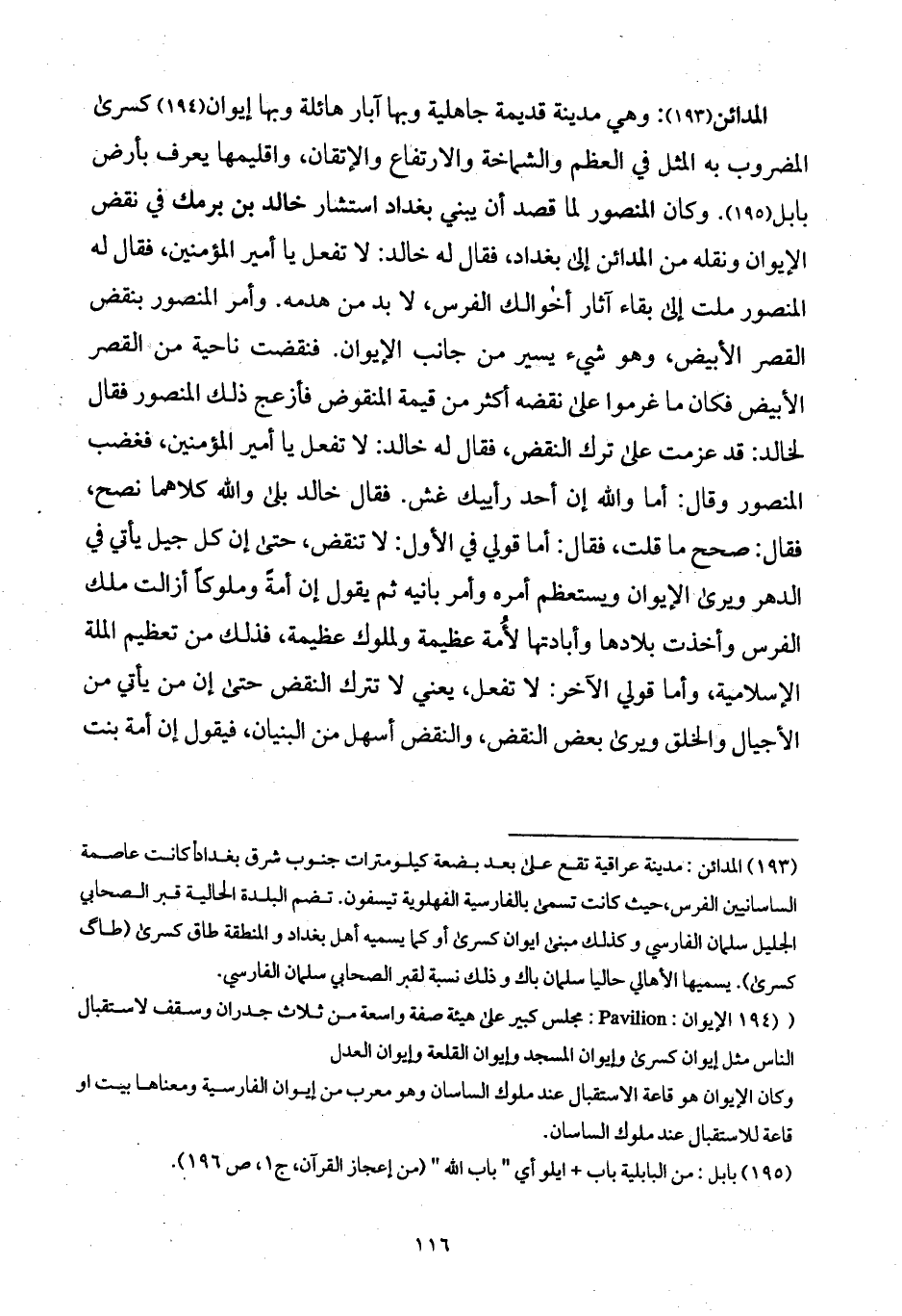 المدائن: وهي مدينة قديمة جاهلية وبها آبار هائلة وبها إيوان كسرى المضروب به المثل في العظم والشماخة والارتفاع والإتقان، واقليمها يعرف بأرض بابل. وكان المنصور لما قصد أن يبني بغداد استشار خالد بن برمك في نقض الإيوان ونقله من المدائن إلى بغداد، فقال له خالد: لا تفعل يا أمير المؤمنين، فقال له المنصور ملت إلى بقاء آثار أخوالك الفرس، لا بد من هدمه. وأمر المنصور بنقض القصر الأبيض، وهو شيء يسير من جانب الإيوان. فنقضت ناحية من القصر الأبيض فكان ما غرموا على نقضه أكثر من قيمة المنقوض فأزعج ذلك المنصور فقال لخالد: قد عزمت على ترك النقض، فقال له خالد: لا تفعل يا أمير المؤمنين، فغضب المنصور وقال: أما والله إن أحد رأييك غش. فقال خالد بلى والله كلاهما نصح، فقال: صحح ما قلت، فقال: أما قولي في الأول: لا تنقض، حتى إن كل جيل يأتي في الدهر ويرى الإيوان ويستعظم أمره وأمر بانيه ثم يقول إن أمةً وملوكاً أزالت ملك الفرس وأخذت بلادها وأبادتها لأُمة عظيمة ولملوك عظيمة، فذلك من تعظيم الملة الإسلامية، وأما قولي الآخر: لا تفعل، يعني لا تترك النقض حتى إن من يأتي من الأجيال والخلق ويرى بعض النقض، والنقض أسهل من البنيان، فيقول إن أمة بنت