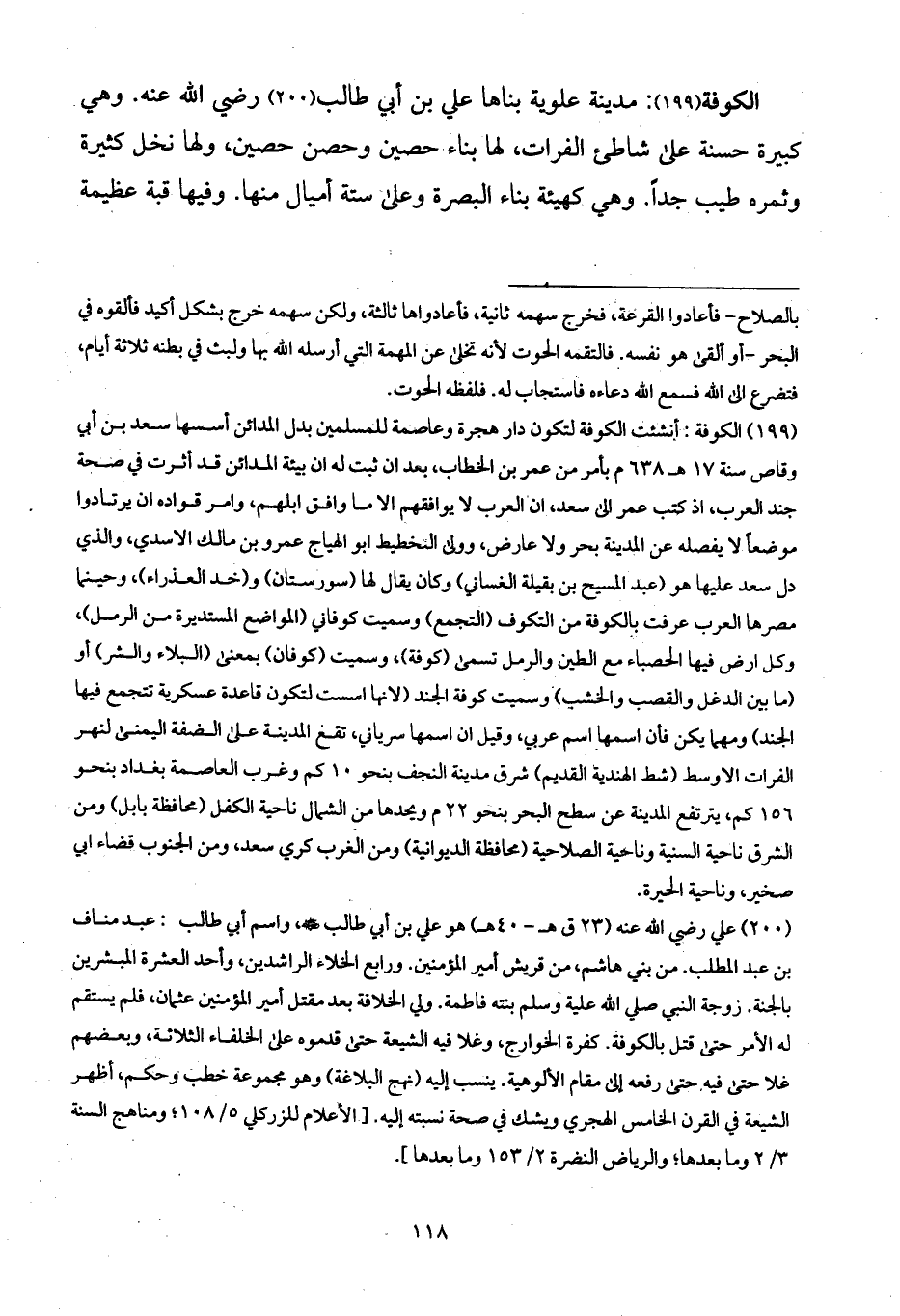 الكوفة: مدينة علوية بناها علي بن أبي طالب رضي الله عنه. وهي كبيرة حسنة على شاطئ الفرات، لها بناء حصين وحصن حصين، ولها نخل كثيرة وثمره طيب جداً. وهي كهيئة بناء البصرة وعلى ستة أميال منها. وفيها قبة عظيمة