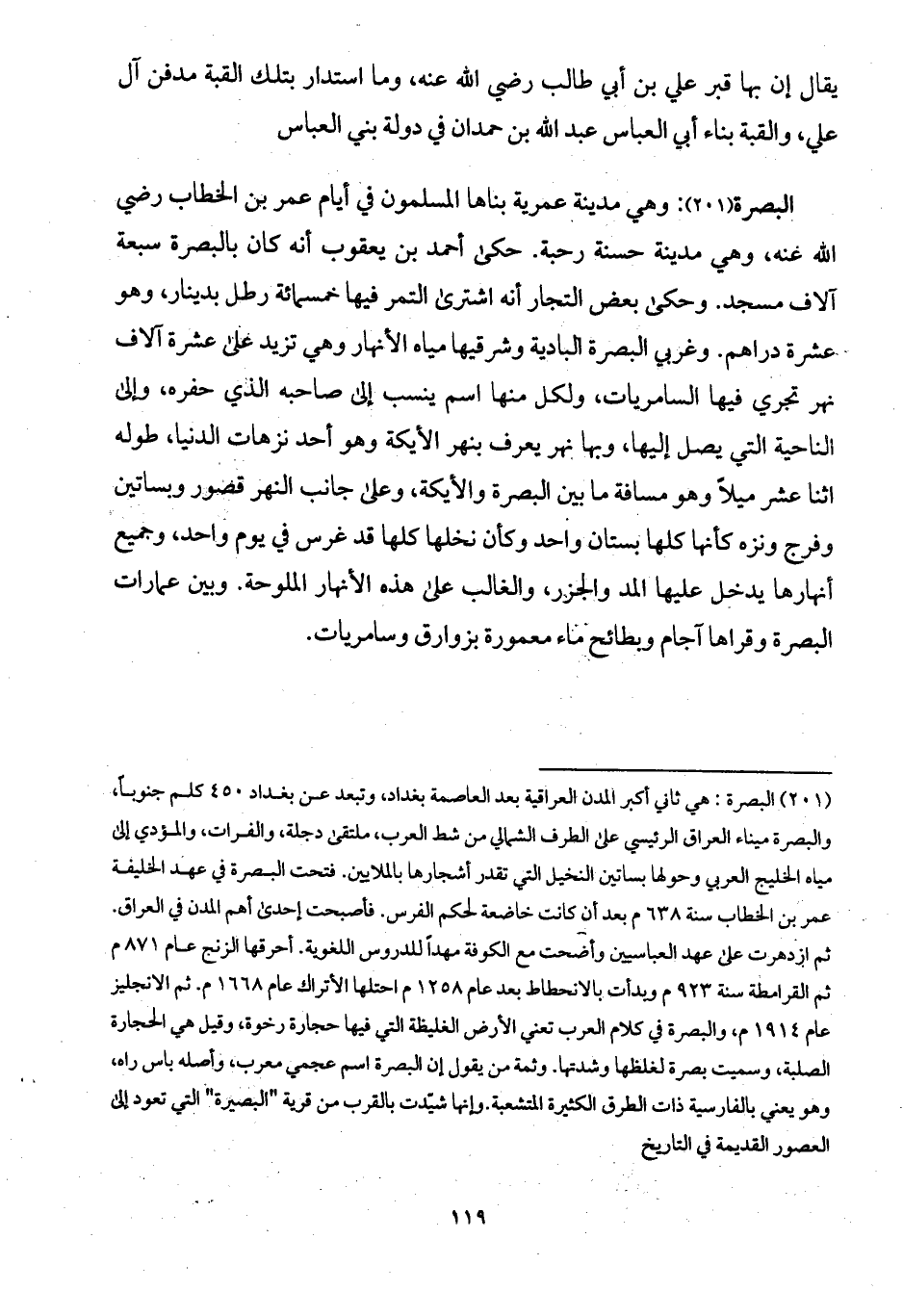 البصرة: وهي مدينة عمرية بناها المسلمون في أيام عمر بن الخطاب رضي الله عنه، وهي مدينة حسنة رحبة. حكى أحمد بن يعقوب أنه كان بالبصرة سبعة آلاف مسجد. وحكى بعض التجار أنه اشترى التمر فيها خمسمائة رطل بدينار، وهو عشرة دراهم. وغربي البصرة البادية وشرقيها مياه الأنهار وهي تزيد على عشرة آلاف نهر تجري فيها السامريات، ولكل منها اسم ينسب إلى صاحبه الذي حفره، وإلى الناحية التي يصل إليها، وبها نهر يعرف بنهر الأيكة وهو أحد نزهات الدنيا، طوله اثنا عشر ميلاً وهو مسافة ما بين البصرة والأيكة، وعلى جانب النهر قصور وبساتين وفرج ونزه كأنها كلها بستان واحد وكأن نخلها كلها قد غرس في يوم واحد، وجميع أنهارها يدخل عليها المد والجزر، والغالب على هذه الأنهار الملوحة. وبين عمارات البصرة وقراها آجام وبطائح ماء معمورة بزوارق وسامريات.