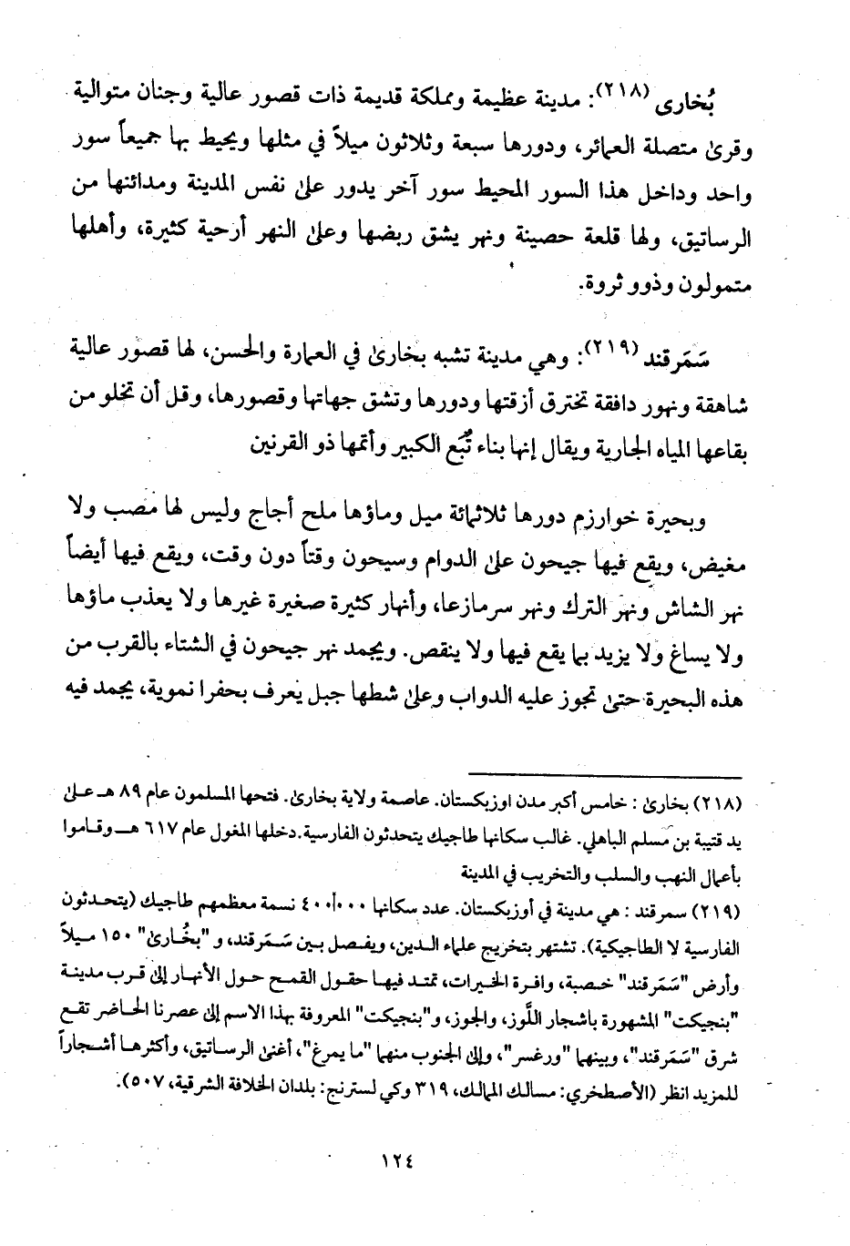 بخارى: مدينة عظيمة ومملكة قديمة ذات قصور عالية وجنان متوالية وقرى متصلة العمائر، ودورها سبعة وثلاثون ميلاً في مثلها ويحيط بها جميعاً سور واحد وداخل هذا السور المحيط سور آخر يدور على نفس المدينة ومدائنها من الرساتيق، ولها قلعة حصينة ونهر يشق ربضها وعلى النهر أرحية كثيرة، وأهلها متمولون وذوو ثروة.