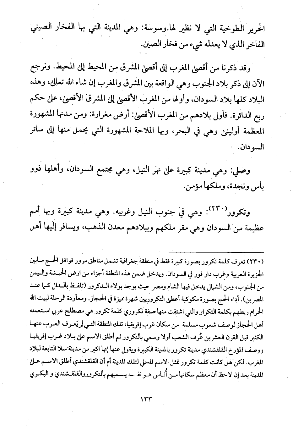 وتكرور: وهي في جنوب النيل وغربيه. وهي مدينة كبيرة وبها أمم عظيمة من السودان وهي مقر ملكهم وببلادهم معدن الذهب، ويسافر إليها أهل