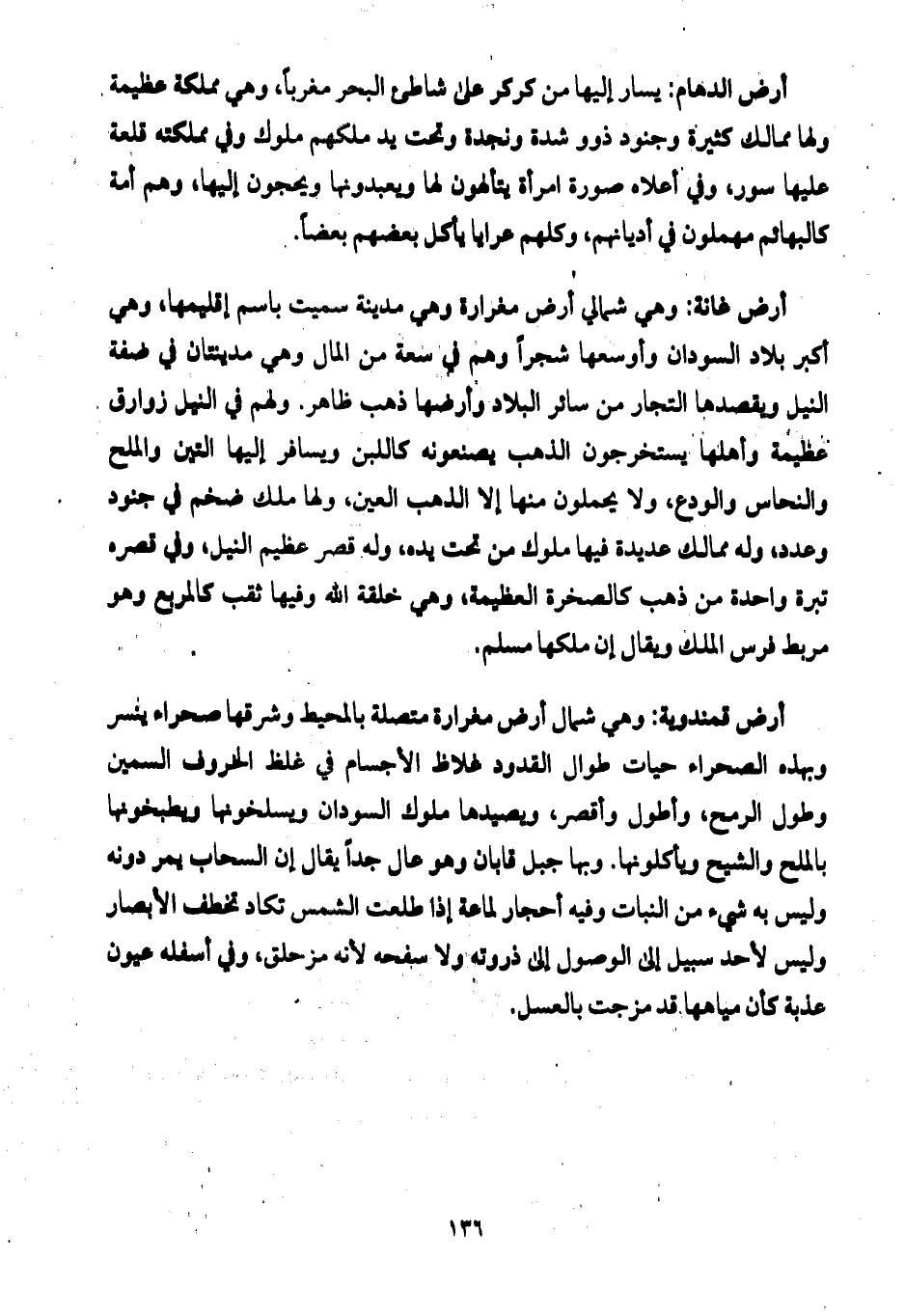 أرض الدهام: يسار إليها من كركر على شاطئ البحر مغرباً، وهي مملكة عظيمة ولها ممالك كثيرة وجنود ذوو شدة ونجدة وتحت يد ملكهم ملوك وفي مملكته قلعة عليها سور، وفي أعلاه صورة امرأة يتألهون لها ويعبدونها ويحجون إليها، وهم أمة كالبهائم مهملون في أديانهم، وكلهم عرايا يأكل بعضهم بعضاً.