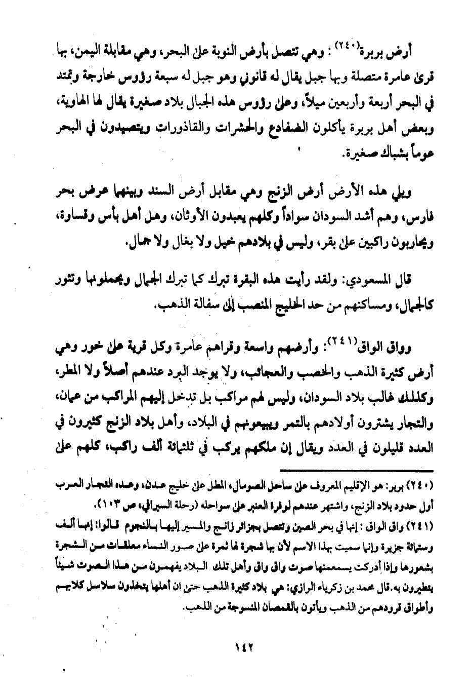 وواق الواق: وأرضهم واسعة وقراهم عامرة وكل قرية على خور وهي أرض كثيرة الذهب والخصب والعجائب، ولا يوجد البرد عندهم أصلاً ولا المطر، وكذلك غالب بلاد السودان، وليس لهم مراكب بل تدخل إليهم المراكب من عمان، والتجار يشترون أولادهم بالتمر ويبيعونهم في البلاد، وأهل بلاد الزنج كثيرون في العدد قليلون في العدد ويقال إن ملكهم يركب في ثلثمائة ألف راكب، كلهم على