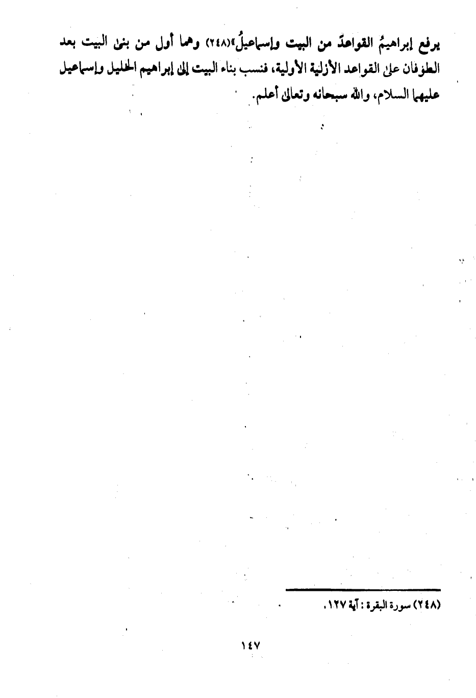 يرفع إبراهيمُ القواعدَ من البيت وإسماعيلُ " وهما أول من بنى البيت بعد الطوفان على القواعد الأزلية الأولية، فنسب بناء البيت إلى إبراهيم الخليل وإسماعيل عليهما السلام، والله سبحانه وتعالى أعلم.