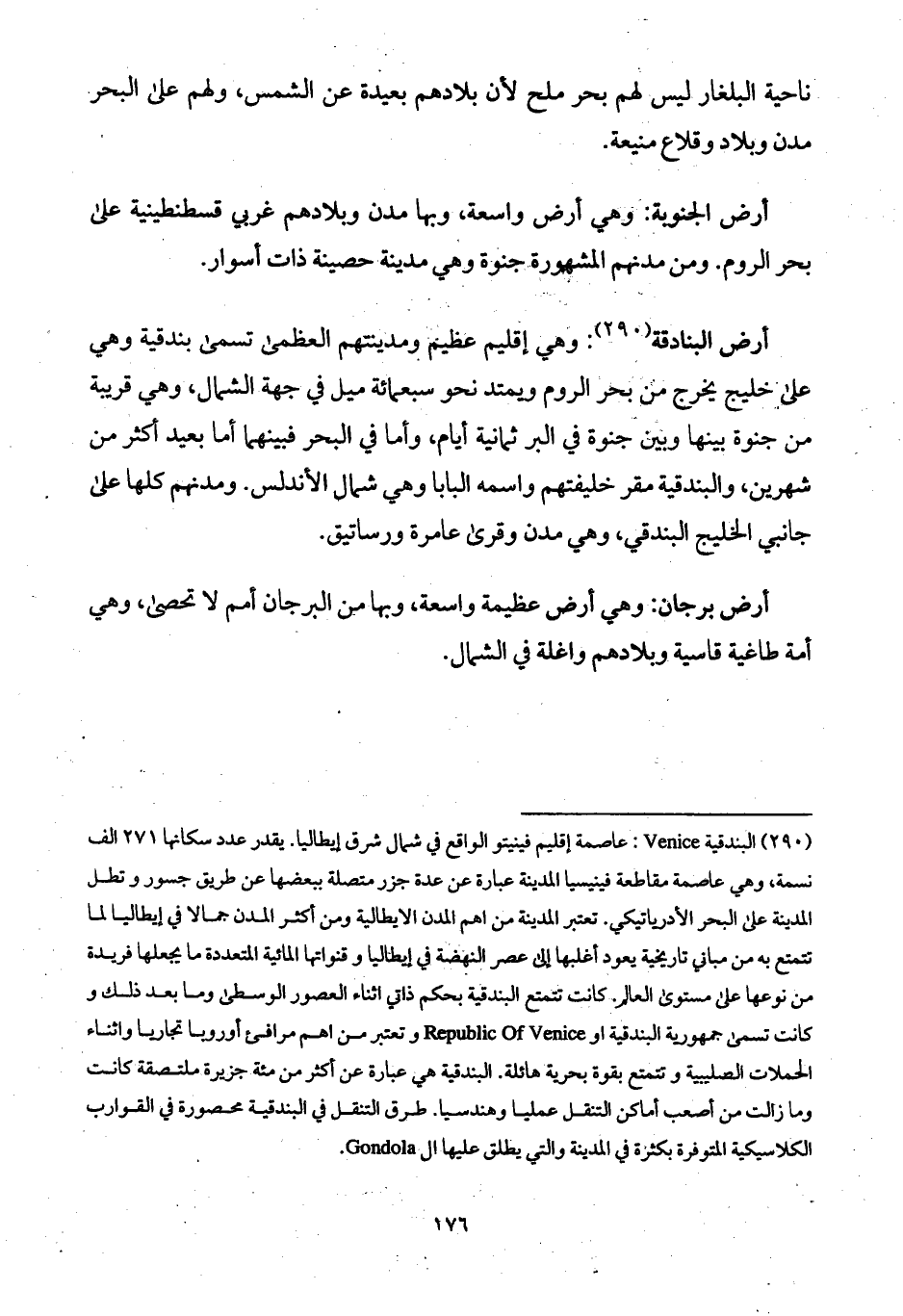 أرض البنادقة: وهي إقليم عظيم ومدينتهم العظمى تسمى بندقية وهي على خليج يخرج من بحر الروم ويمتد نحو سبعمائة ميل في جهة الشمال، وهي قريبة من جنوة بينها وبين جنوة في البر ثمانية أيام، وأما في البحر فبينهما أما بعيد أكثر من شهرين، والبندقية مقر خليفتهم واسمه البابا وهي شمال الأندلس. ومدنهم كلها على جانبي الخليج البندقي، وهي مدن وقرى عامرة ورساتيق.