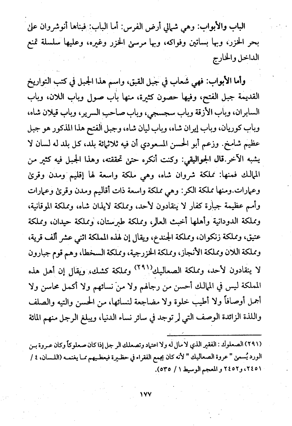 ومنها مملكة الكر: وهي مملكة واسعة ذات أقاليم ومدن وقرى وعمارات وأمم عظيمة جبارة كفار لا ينقادون لأحد، ومملكة لايذان شاه، ومملكة الموقانية، ومملكة الدودانية وأهلها أخبث العالم، ومملكة طبرستان، ومملكة حيدان، ومملكة عتيق، ومملكة زنكوان، ومملكة الجندخ، ويقال إن لهذه المملكة اثني عشر ألف قرية، ومملكة اللان ومملكة الأنجاز، ومملكة الخزرجية، ومملكة السخطا، وهم قوم جبارون لا ينقادون لأحد، ومملكة الصعاليك ومملكة كشك، ويقال إن أهل هذه المملكة ليس في الممالك أحسن من رجالهم ولا من نسائهم ولا أكمل محاسن ولا أجمل أوصافاً ولا أطيب خلوة ولا مضاجعة لنسائها، من الحسن والتيه والصلف واللذة الزائدة الوصف التي لم توجد في سائر نساء الدنيا، ويبلغ الرجل منهم المائة