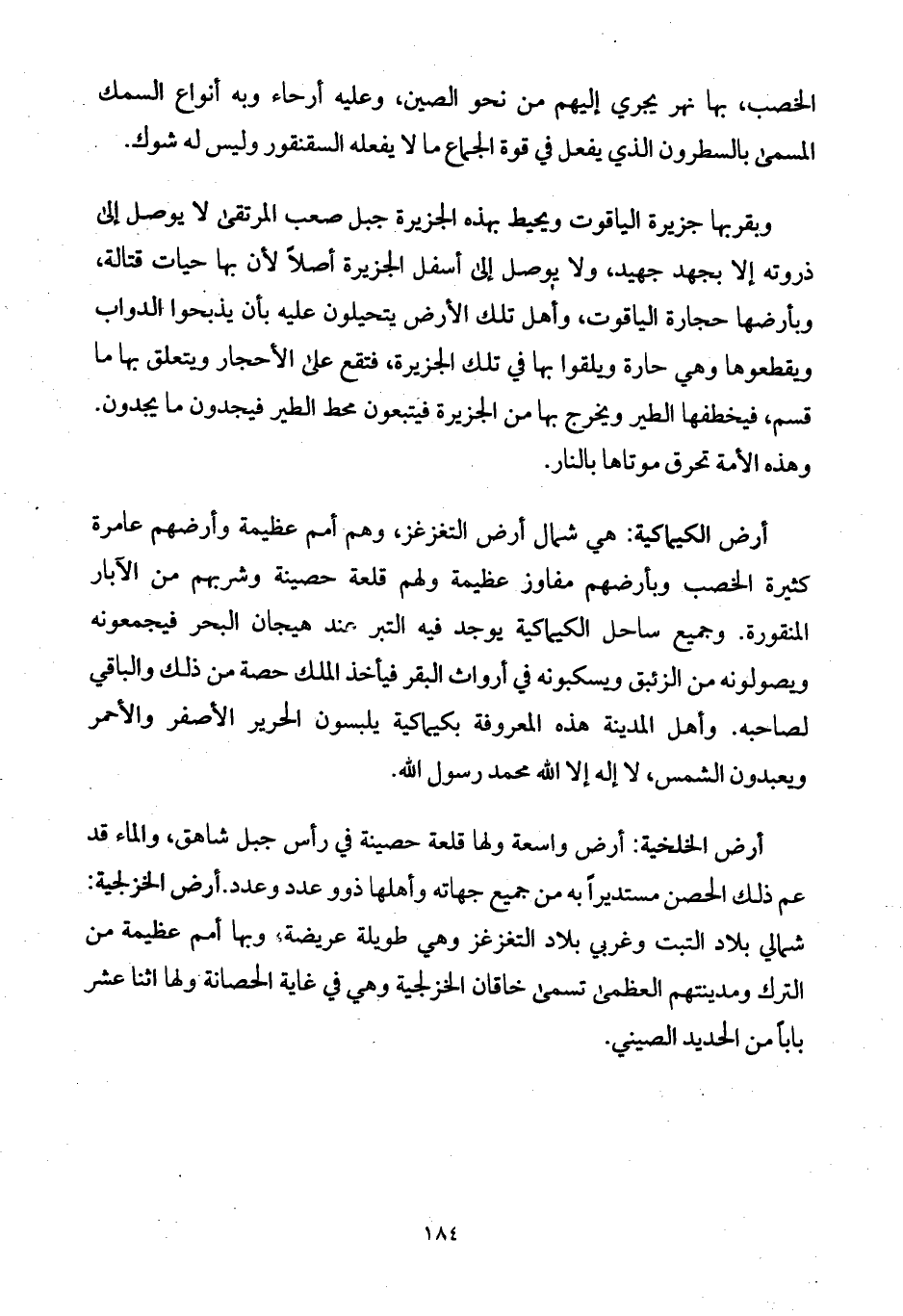 الخصب، بها نهر يجري إليهم من نحو الصين، وعليه أرحاء وبه أنواع السمك المسمى بالسطرون الذي يفعل في قوة الجماع ما لا يفعله السقنقور وليس له شوك.