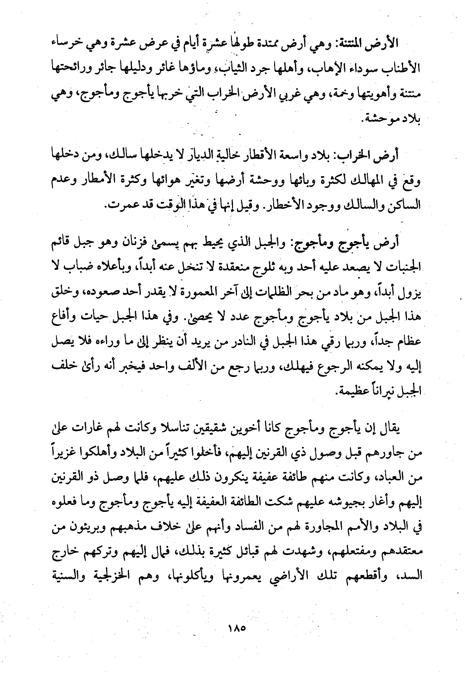 أرض يأجوج ومأجوج: والجبل الذي يحيط بهم يسمى فزنان وهو جبل قائم الجنبات لا يصعد عليه أحد وبه ثلوج منعقدة لا تنحل عنه أبداً، وبأعلاه ضباب لا يزول أبداً، وهو ماد من بحر الظلمات إلى آخر المعمورة لا يقدر أحد صعوده، وخلق هذا الجبل من بلاد يأجوج ومأجوج عدد لا يحصى. وفي هذا الجبل حيات وأفاع عظام جداً، وربما رقي هذا الجبل في النادر من يريد أن ينظر إلى ما وراءه فلا يصل إليه ولا يمكنه الرجوع فيهلك، وربما رجع من الألف واحد فيخبر أنه رأى خلف الجبل نيراناً عظيمة.