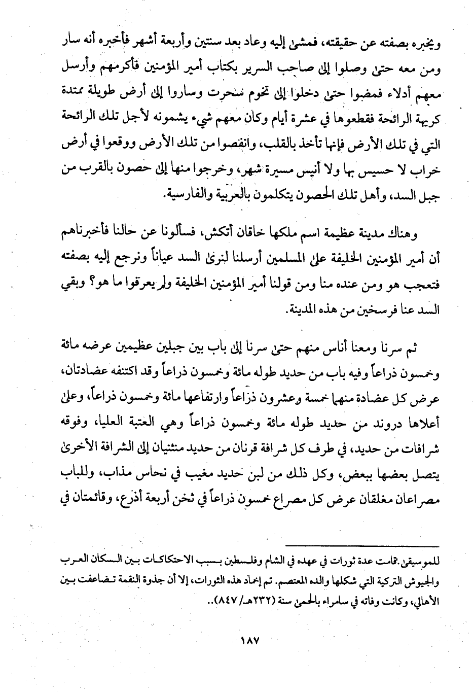 ويخبره بصفته عن حقيقته، فمشى إليه وعاد بعد سنتين وأربعة أشهر فأخبره أنه سار ومن معه حتى وصلوا إلى صاحب السرير بكتاب أمير المؤمنين فأكرمهم وأرسل معهم أدلاء فمضوا حتى دخلوا إلى تخوم سحرت وساروا إلى أرض طويلة ممتدة كريهة الرائحة فقطعوها في عشرة أيام وكان معهم شيء يشمونه لأجل تلك الرائحة التي في تلك الأرض فإنها تأخذ بالقلب، وانفصوا من تلك الأرض ووقعوا في أرض خراب لا حسيس بها ولا أنيس مسيرة شهر، وخرجوا منها إلى حصون بالقرب من جبل السد، وأهل تلك الحصون يتكلمون بالعربية والفارسية.