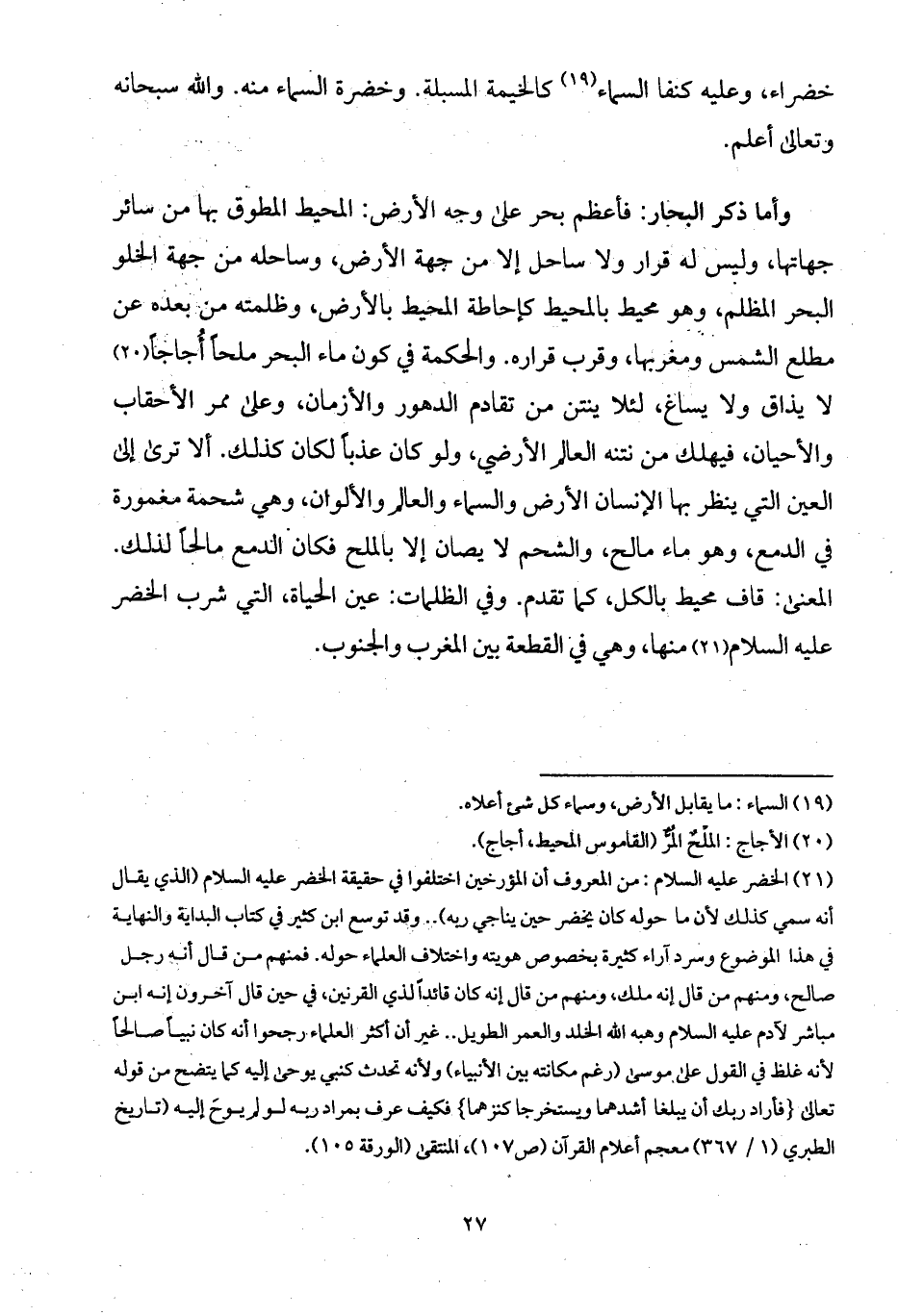 وأما ذكر البحار: فأعظم بحر على وجه الأرض: المحيط المطوق بها من سائر جهاتها، وليس له قرار ولا ساحل إلا من جهة الأرض، وساحله من جهة الخلو البحر المظلم، وهو محيط بالمحيط كإحاطة المحيط بالأرض، وظلمته من بعده عن مطلع الشمس ومغربها، وقرب قراره. والحكمة في كون ماء البحر ملحاً أُجاجاً لا يذاق ولا يساغ، لئلا ينتن من تقادم الدهور والأزمان، وعلى ممر الأحقاب والأحيان، فيهلك من نتنه العالم الأرضي، ولو كان عذباً لكان كذلك. ألا ترى إلى العين التي ينظر بها الإنسان الأرض والسماء والعالم والألوان، وهي شحمة مغمورة في الدمع، وهو ماء مالح، والشحم لا يصان إلا بالملح فكان الدمع مالحاً لذلك. المعنى: قاف محيط بالكل، كما تقدم. وفي الظلمات: عين الحياة، التي شرب الخضر عليه السلام منها، وهي في القطعة بين المغرب والجنوب.