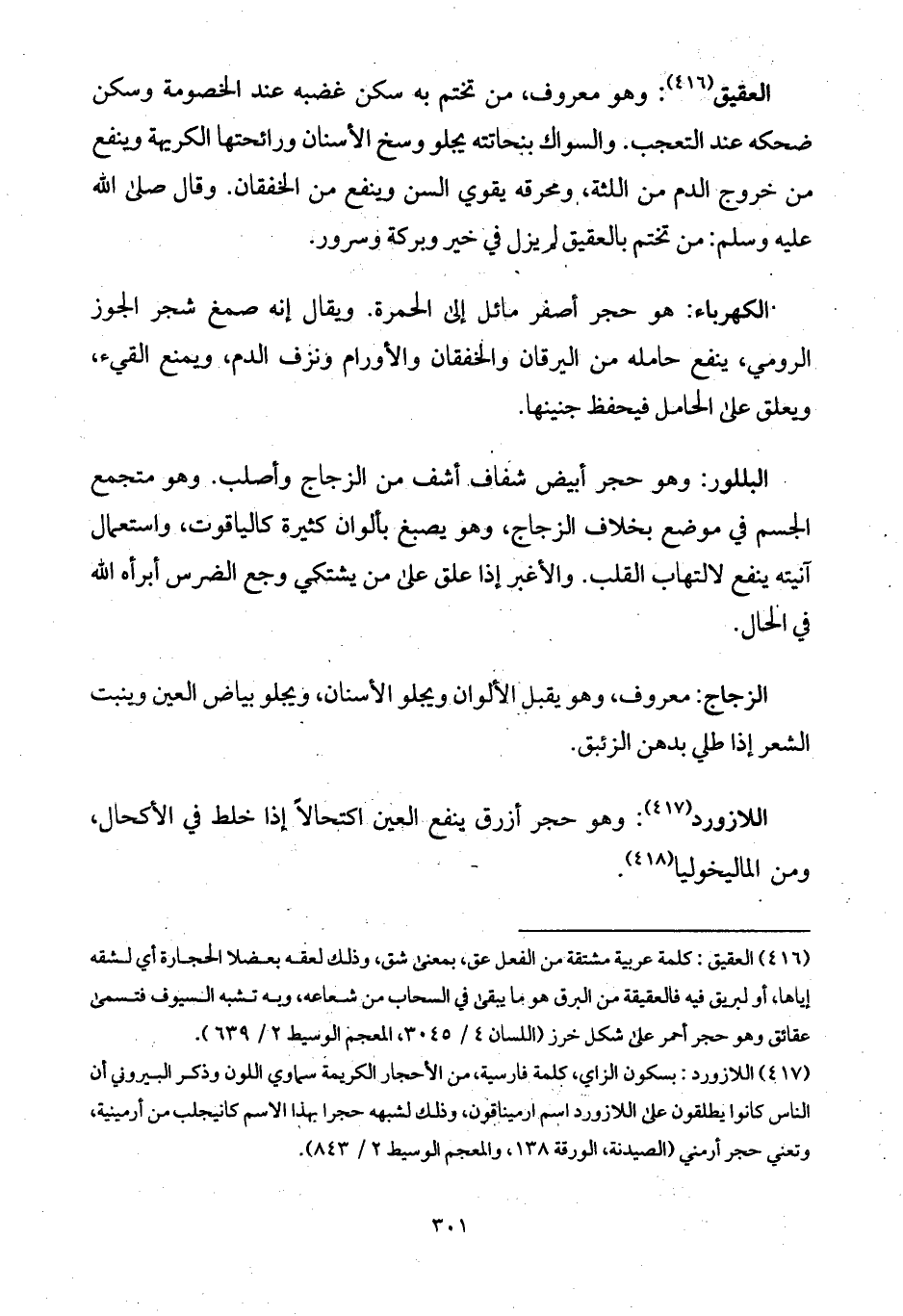 العقيق: وهو معروف، من تختم به سكن غضبه عند الخصومة وسكن ضحكه عند التعجب. والسواك بنحاتته يجلو وسخ الأسنان ورائحتها الكريهة وينفع من خروج الدم من اللثة، ومحرقه يقوي السن وينفع من الخفقان. وقال صلى الله عليه وسلم: من تختم بالعقيق لم يزل في خير وبركة وسرور.