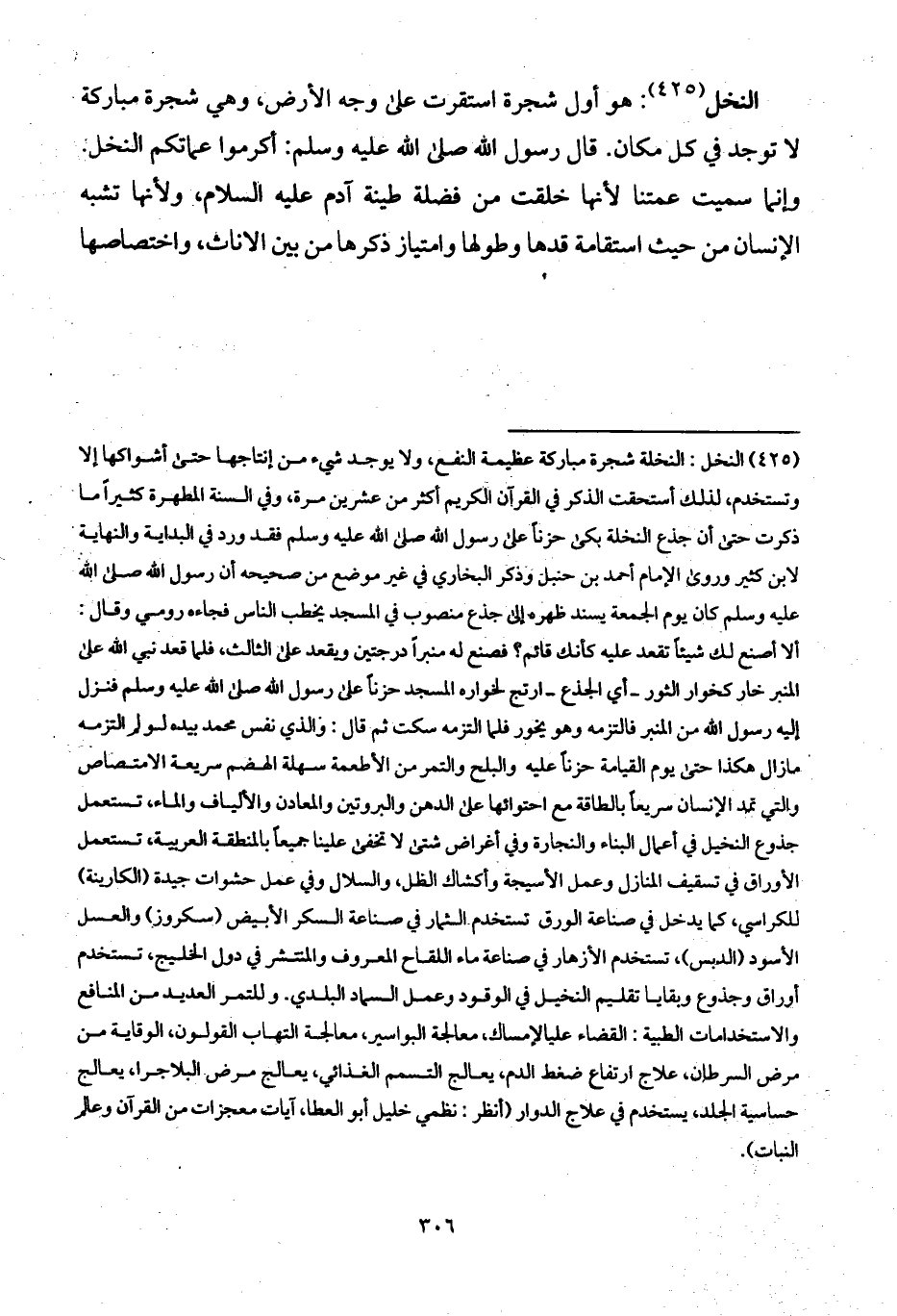 النخل: هو أول شجرة استقرت على وجه الأرض، وهي شجرة مباركة لا توجد في كل مكان. قال رسول الله صلى الله عليه وسلم: أكرموا عماتكم النخل. وإنما سميت عمتنا لأنها خلقت من فضلة طينة آدم عليه السلام، ولأنها تشبه الإنسان من حيث استقامة قدها وطولها وامتياز ذكرها من بين الاناث، واختصاصها