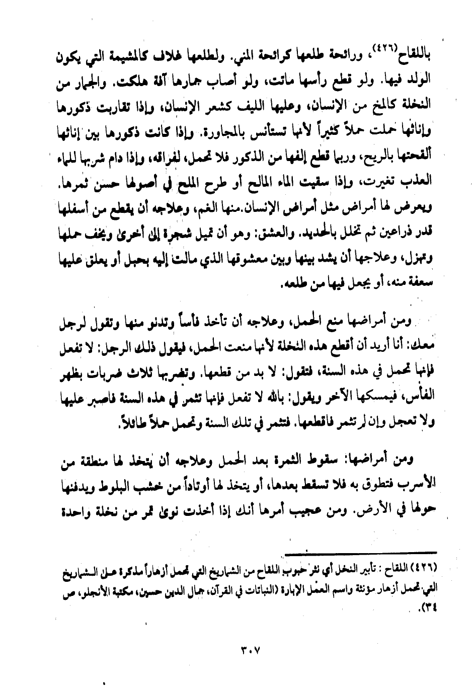 باللقاح، ورائحة طلعها كرائحة المني. ولطلعها غلاف كالمشيمة التي يكون الولد فيها. ولو قطع رأسها ماتت، ولو أصاب جمارها آفة هلكت. والجمار من النخلة كالمخ من الإنسان، وعليها الليف كشعر الإنسان، وإذا تقاربت ذكورها وإناثها حملت حملاً كثيراً لأنها تستأنس بالمجاورة. وإذا كانت ذكورها بين إناثها ألقحتها بالريح، وربما قطع إلفها من الذكور فلا تحمل، لفراقه، وإذا دام شربها للماء العذب تغيرت، وإذا سقيت الماء المالح أو طرح الملح في أصولها حسن ثمرها. ويعرض لها أمراض مثل أمراض الإنسان.