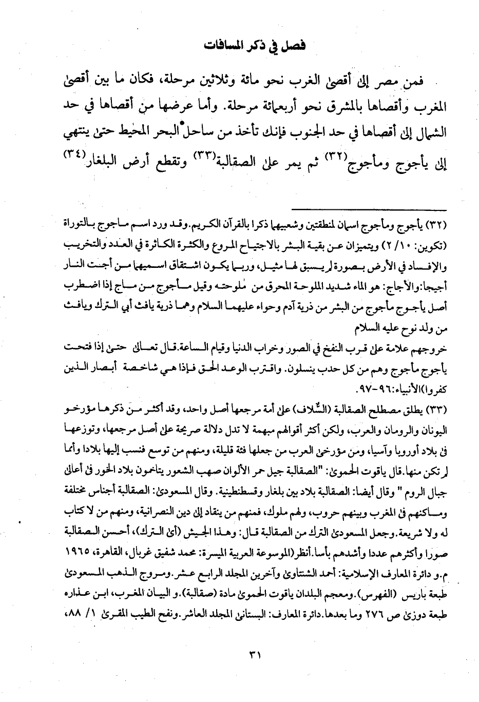 فمن مصر إلى أقصى الغرب نحو مائة وثلاثين مرحلة، فكان ما بين أقصى المغرب وأقصاها بالمشرق نحو أربعمائة مرحلة. وأما عرضها من أقصاها في حد الشمال إلى أقصاها في حد الجنوب فإنك تأخذ من ساحل البحر المحيط حتى ينتهي إلى يأجوج ومأجوج ثم يمر على الصقالبة وتقطع أرض البلغار