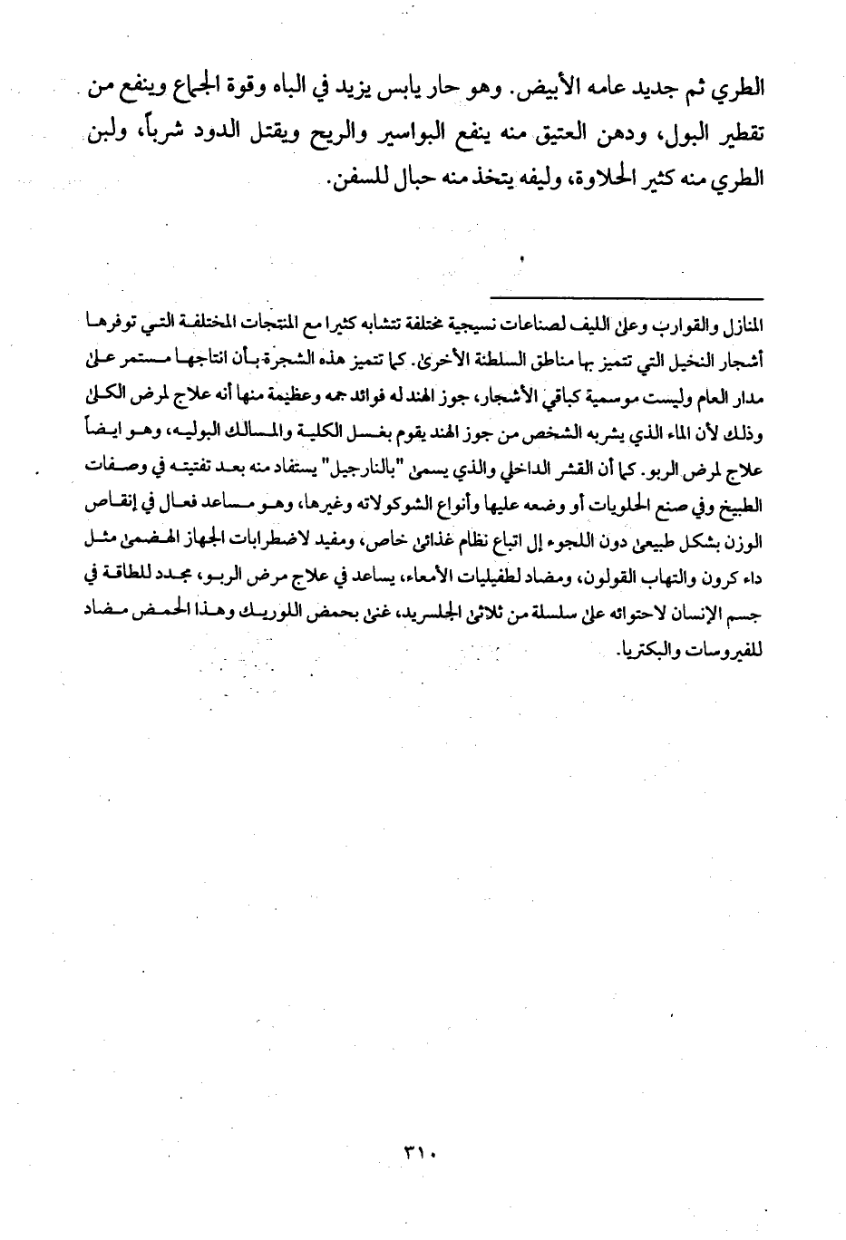 الطري ثم جديد عامه الأبيض. وهو حار يابس يزيد في الباه وقوة الجماع وينفع من تقطير البول، ودهن العتيق منه ينفع البواسير والريح ويقتل الدود شرباً، ولبن الطري منه كثير الحلاوة، وليفه يتخذ منه حبال للسفن.
